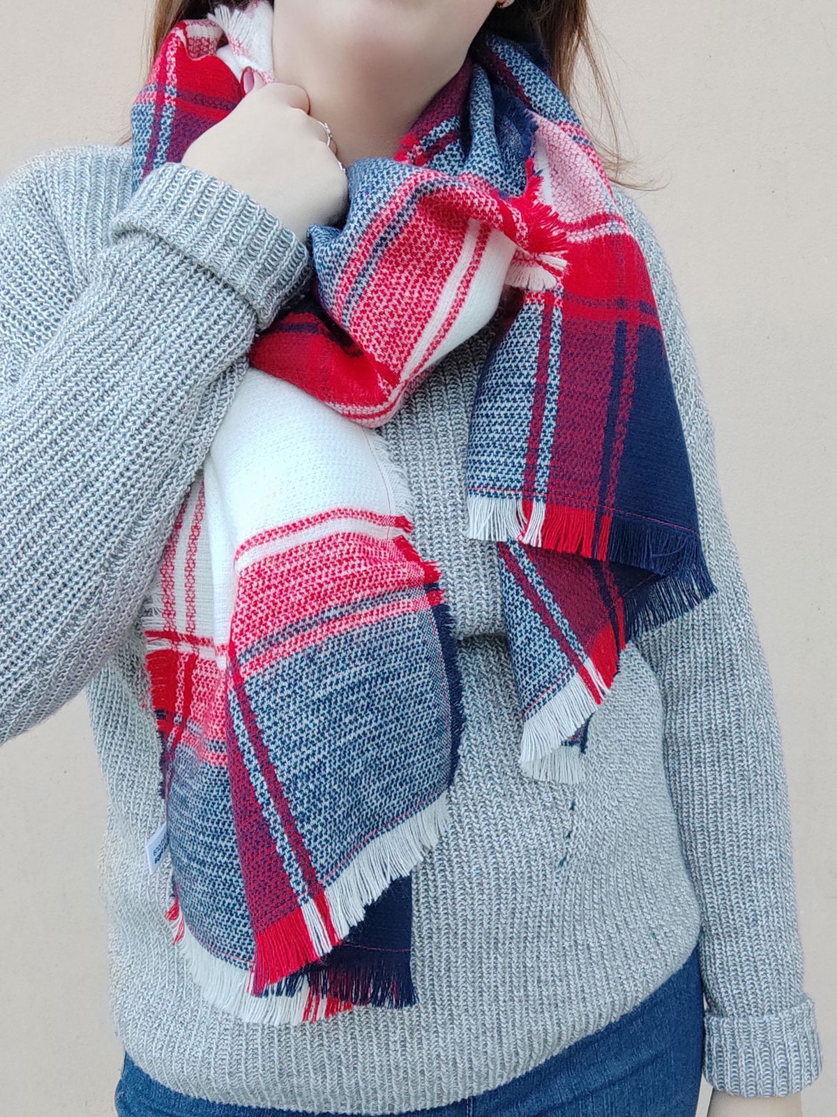 Mide 2,00 cm x 0,50 cm. Es súper linda y calentita y trae flecos en todos sus lados con una costura, a modo de terminación, para que no se deshilache de más.