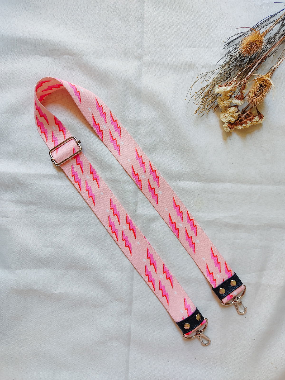 Mide 4 Cm de ancho, y al tener regulador, el largo se puede variar entre 0,75 Cm y 1,30. En cada extremo tiene un mosquetón para que puedas intercambiarlas con tus carteras y darles otra onda. Todos los herrajes son color níquel.