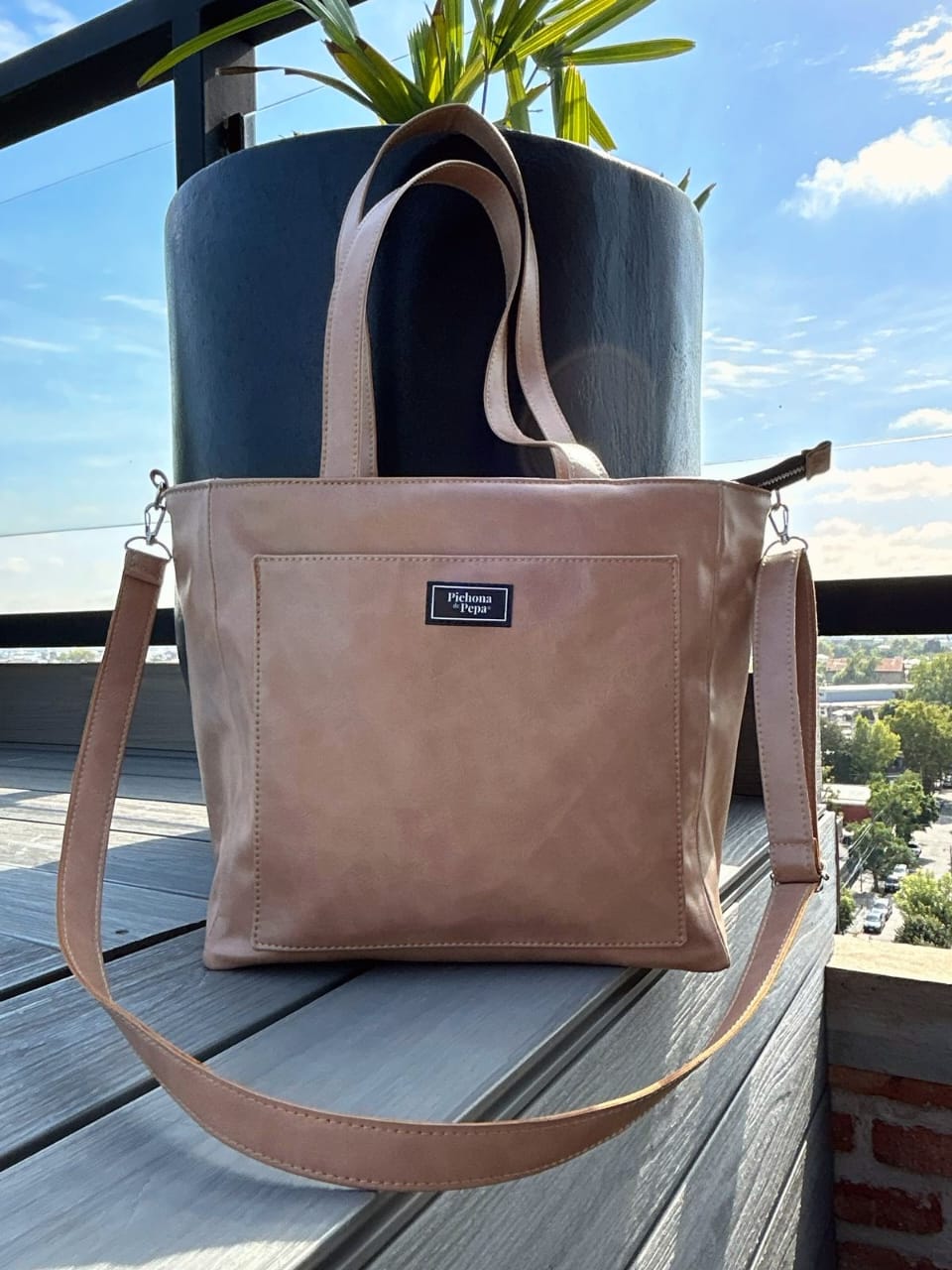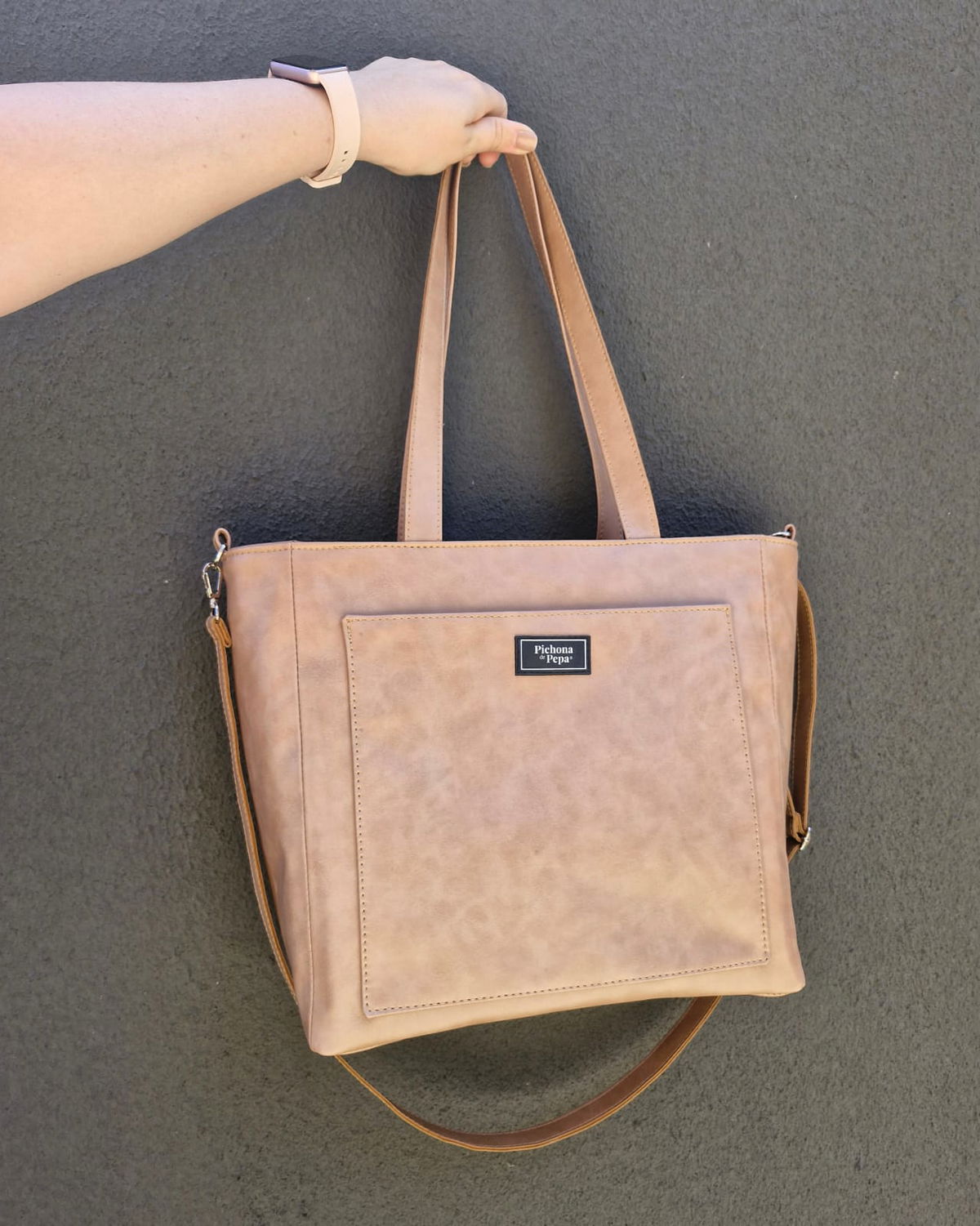 Mide 30 cm de alto por 33 cm de ancho en su base y 44 cm de ancho en su parte superior, con una profundidad de 13 cm. Esta completamente forrada, el compartimiento principal tiene cierre y en su interior cuenta con un bolsillo de 20 x 14 cm. En el frente tiene otro bolsillo de 26 cm x23 cm con un broche imán a modo de cierre. Las correas de hombro tienen 60 cm de largo y adicionalmente viene con una correa larga desmontable cuyo largo se puede regular entre 70 cm y 1,30.