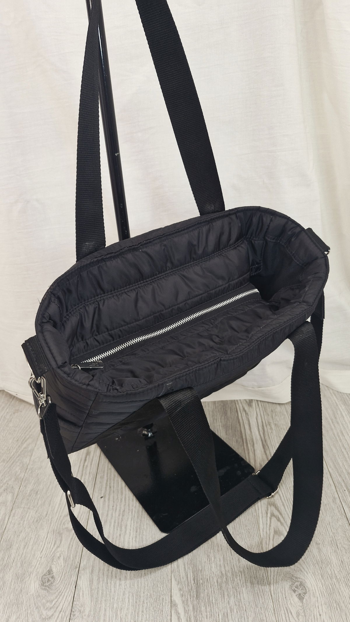 Trae una correa corta de 60 cm de largo y una regulable de 1.30 mts max que se puede sacar.