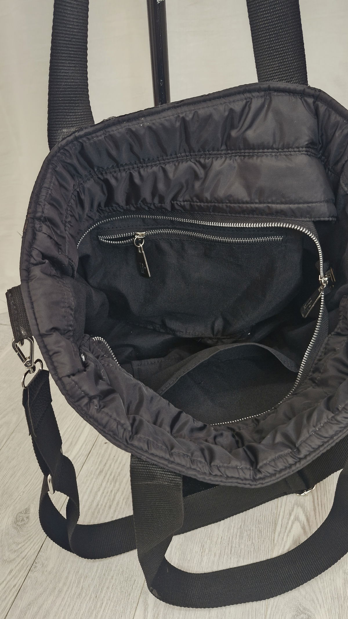 Tiene un compartimento principal, con cierre de aluminio y en el interior hay un bolsillo con cierre de 20 cm de ancho por 14 cm de alto y otro sin cierre de 20 cm de ancho por 14 cm de alto.