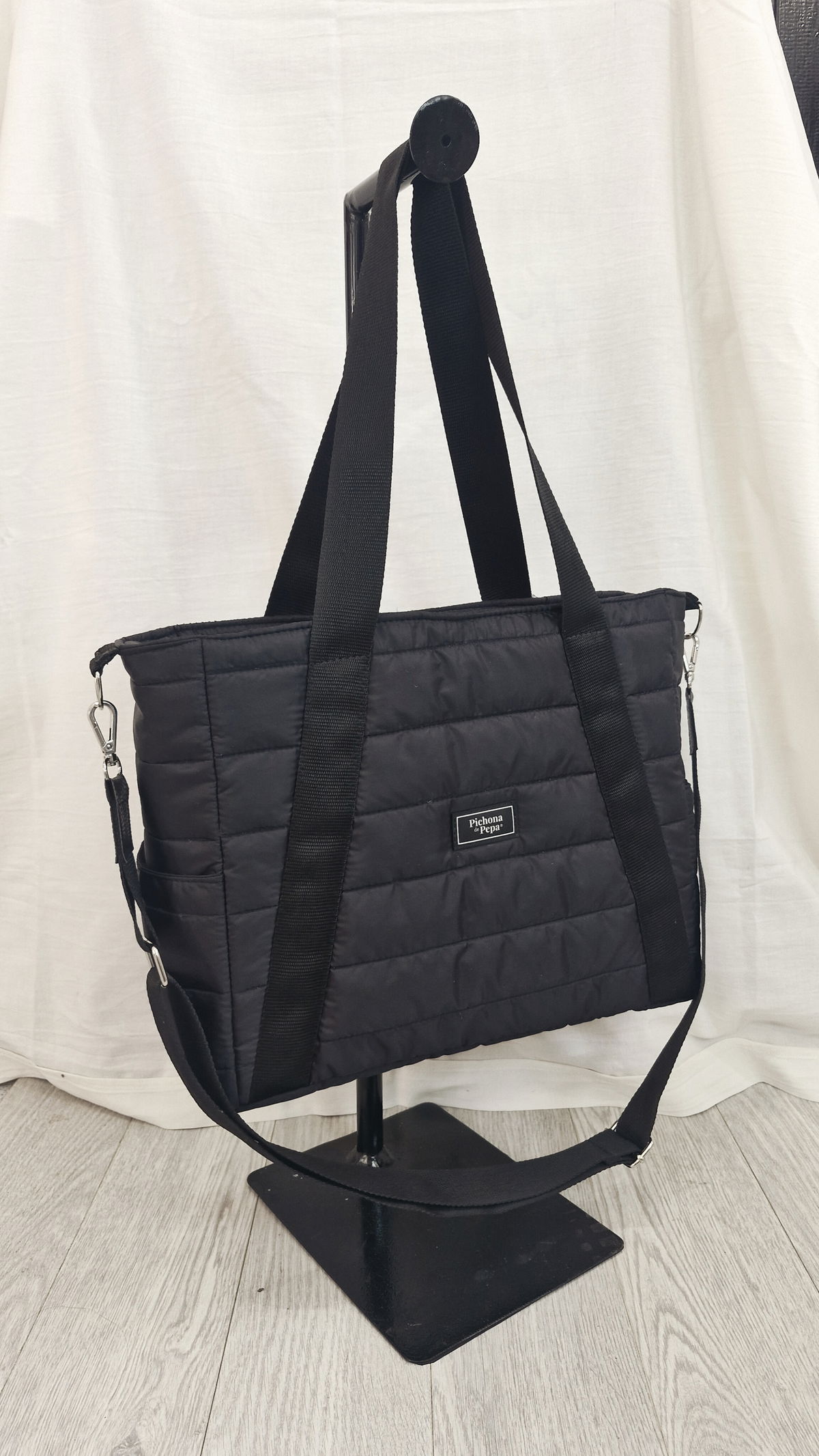 Mide 35 cm de ancho x 30 cm de alto x 14 cm de profundidad y está confeccionada en tela acolchonada.