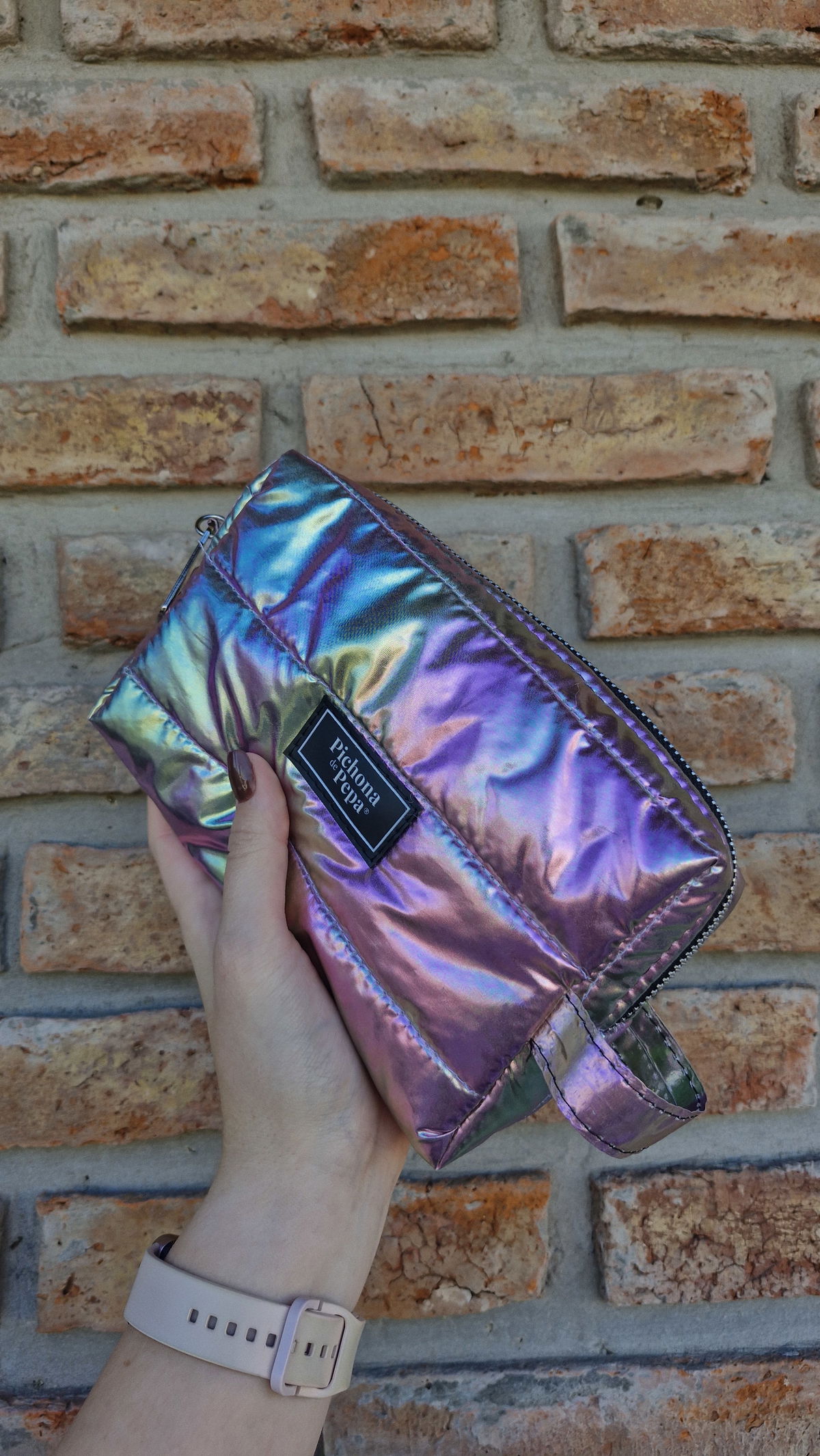 Mide 20 cm de largo, por 12 de alto, por 7 cm de profundidad. Tiene cierre metálico y su interior esta forrado con tela impermeable, lo cual permite limpiar fácilmente las manchas.