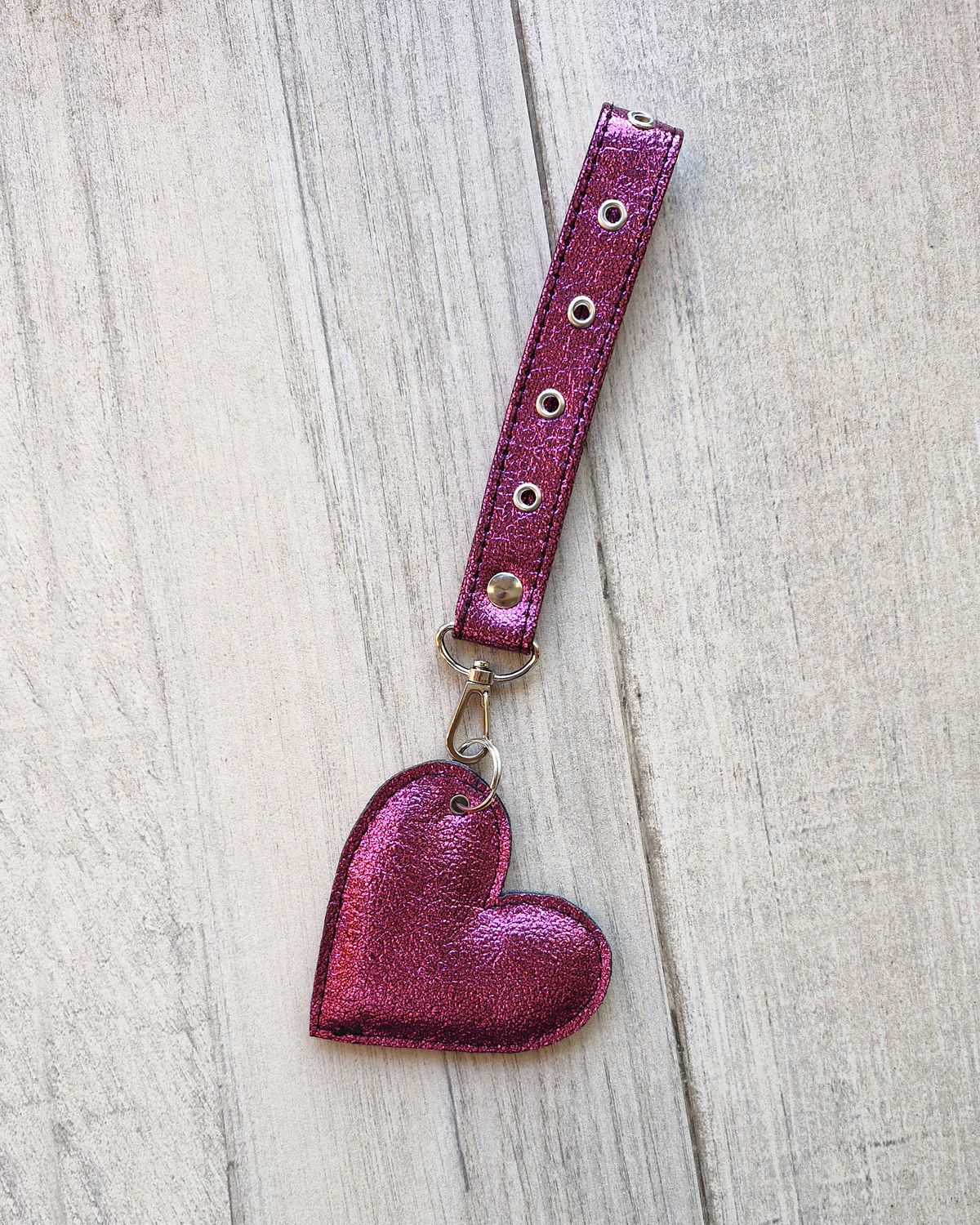 El corazón mide 8 cm aprox y tiene una argolla de llavero. La correa 16 cm. de largo. y tiene un mosquetón. Podes usarlos juntos o por separado.