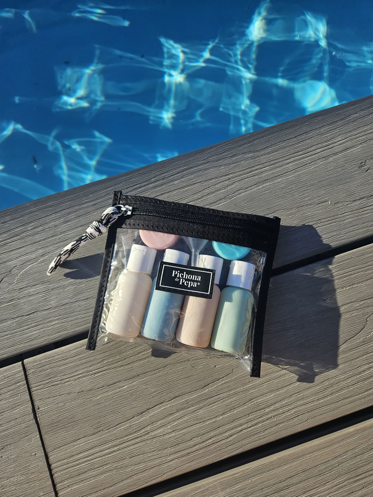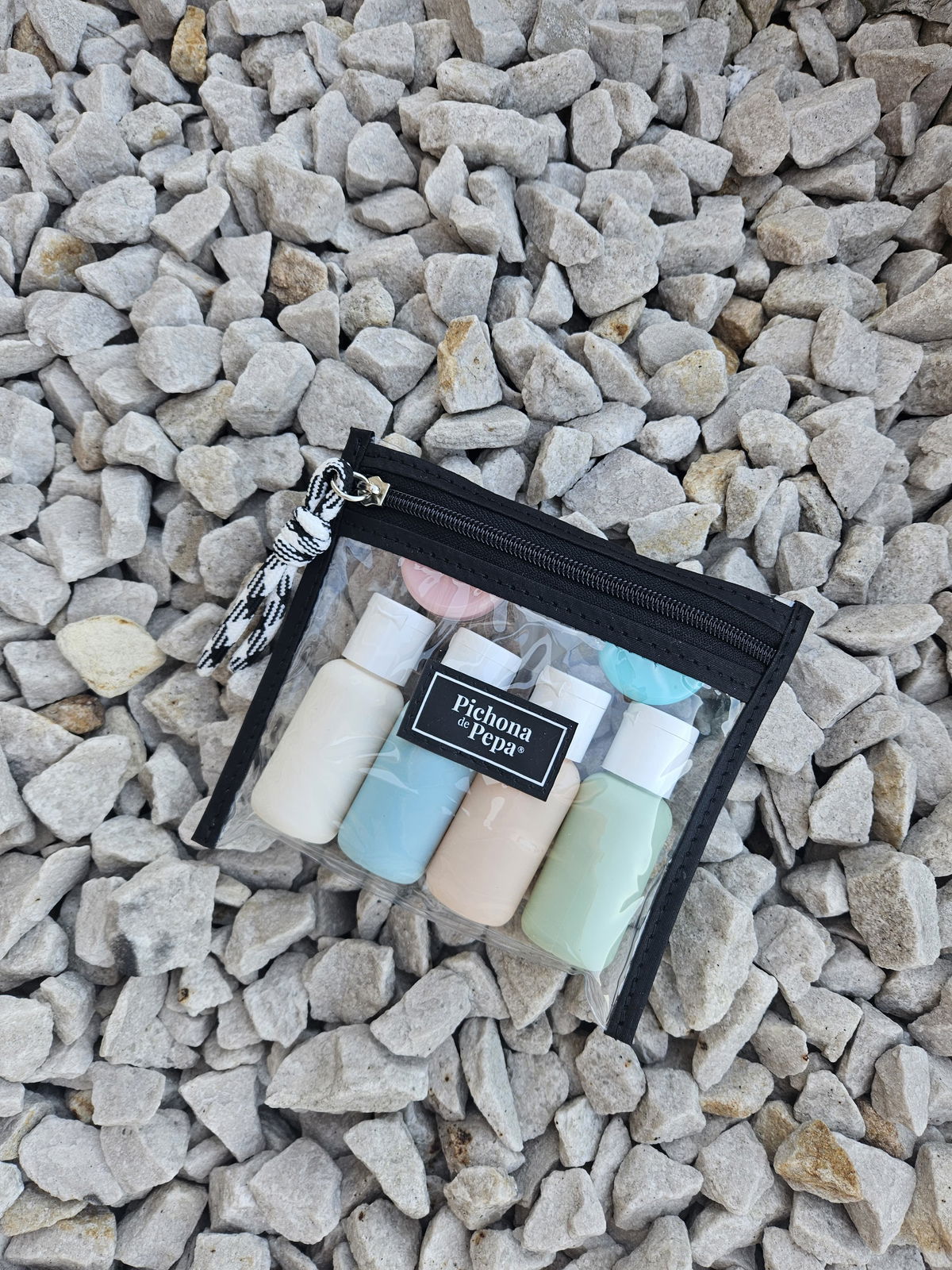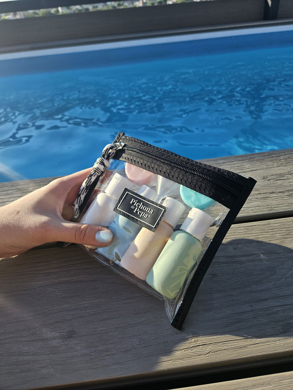 El neceser es de nylon cristal y mide 17 cm de ancho x 15 cm de alto. Inluye 4 botellitas, 2 frascos, espátula y embudo.