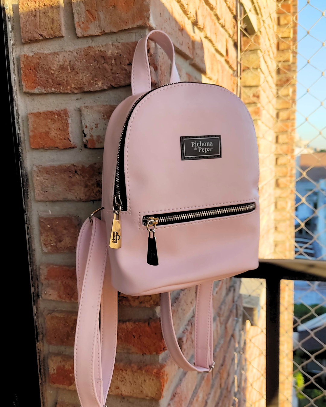 Mide 24 cm de alto x 20 cm de ancho, tiene un compartimiento principal con cierre y un bolsillo delantero también con cierre. Entra botella de 500 cc, billetera grande, etc. Correas regulables.