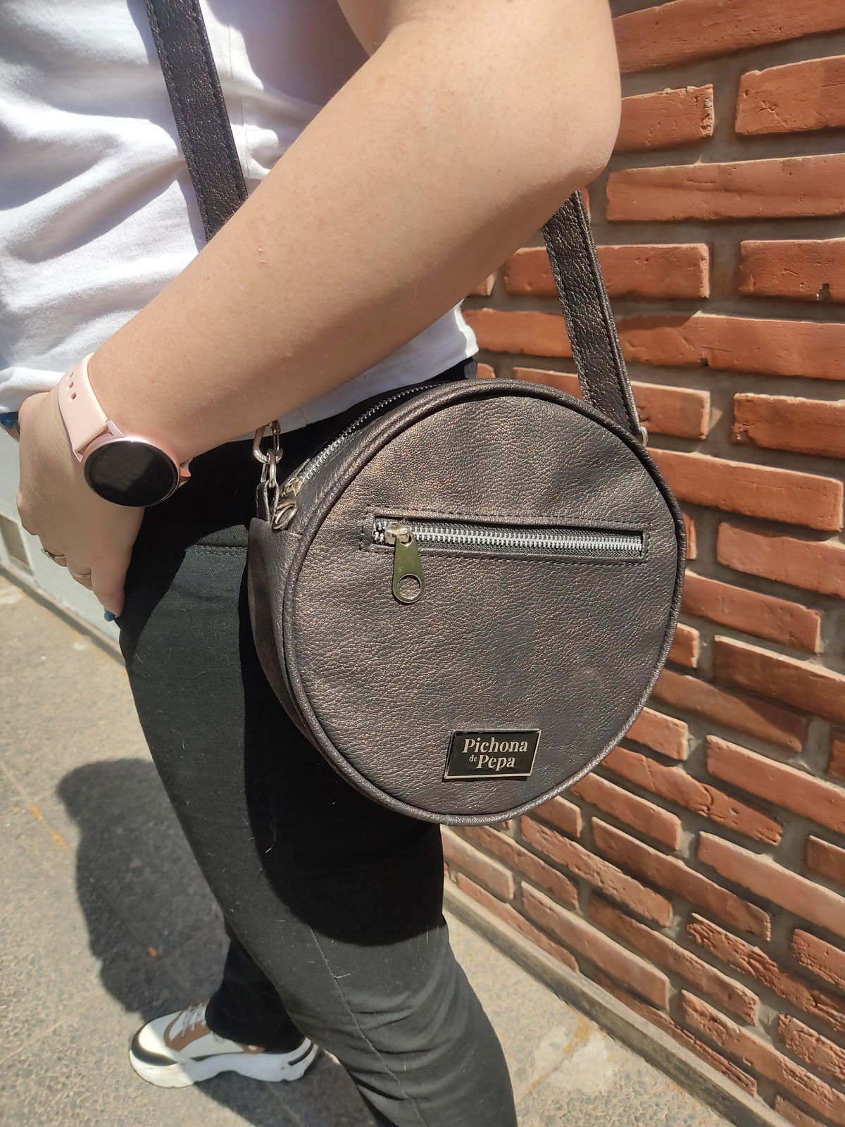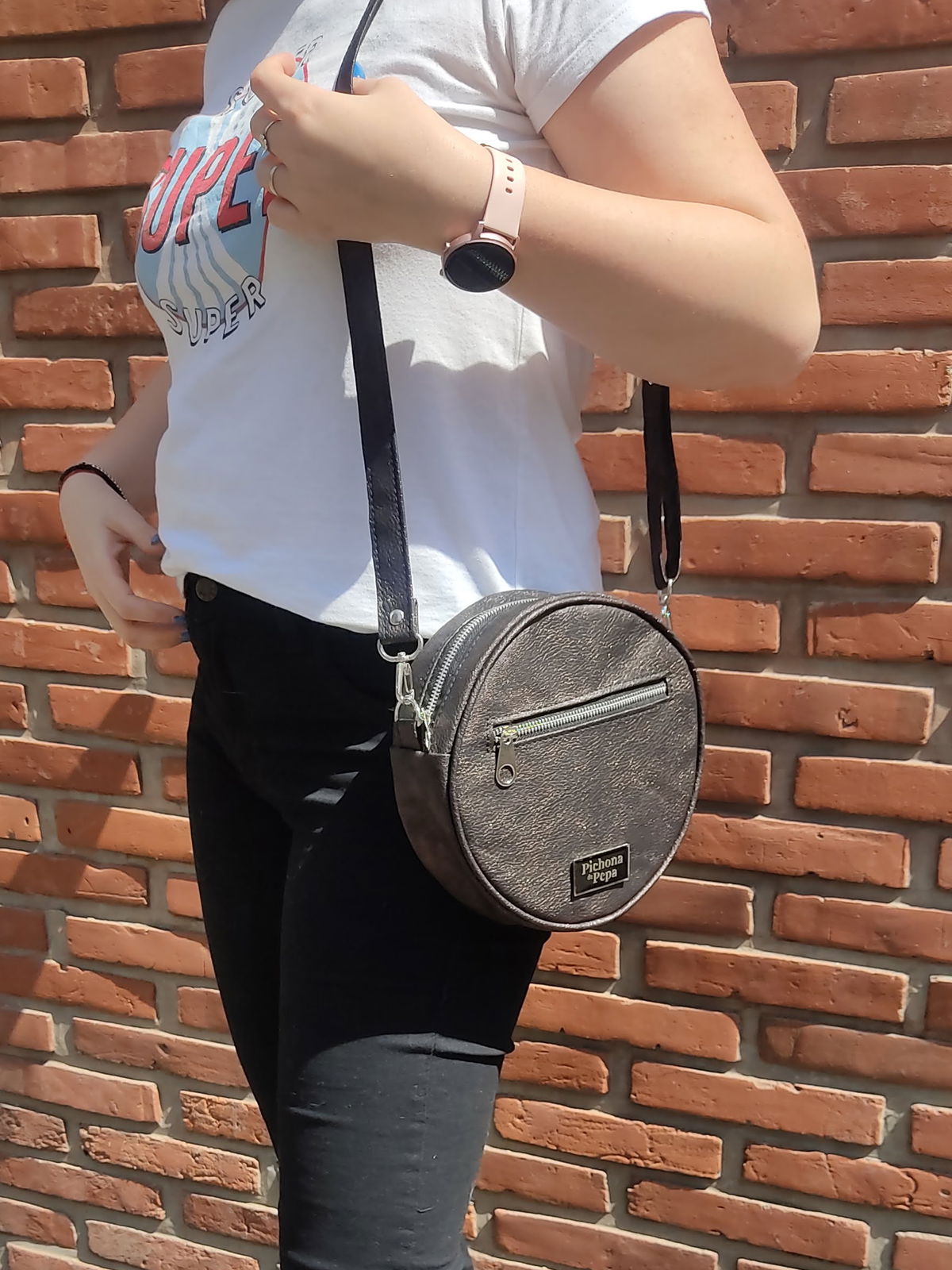 Mide 22 cm de diámetro y tiene una profundidad de 6 cm. Está completamente forrada, tiene un compartimento principal con cierre metálico y un bolsillo en la parte del frente, también con cierre. Trae una correa regulable entre 75 cm y 1.30 mts, con un mosquetón en cada extremo para que puedas intercambiarla con otras.