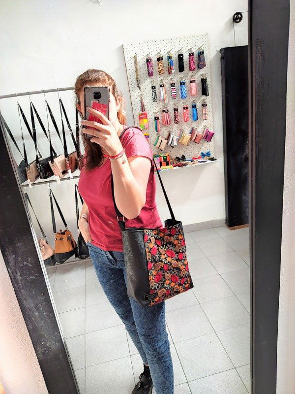 Mide 29 cm de alto x 28 cm de ancho en su base y 44 cm de ancho en su parte superior, con una profundidad de 14 cm. En su interior están completamente forradas y tienen un bolsillo divisor interno de 44 x 22 cm con cierre de extremo a extremo. A modo de cierre tienen un broche imán. La correa tiene un ancho de 4 cm y el largo se puede variar entre 60 cm y 1,20 mts. Psst entran cuadernos A4!
