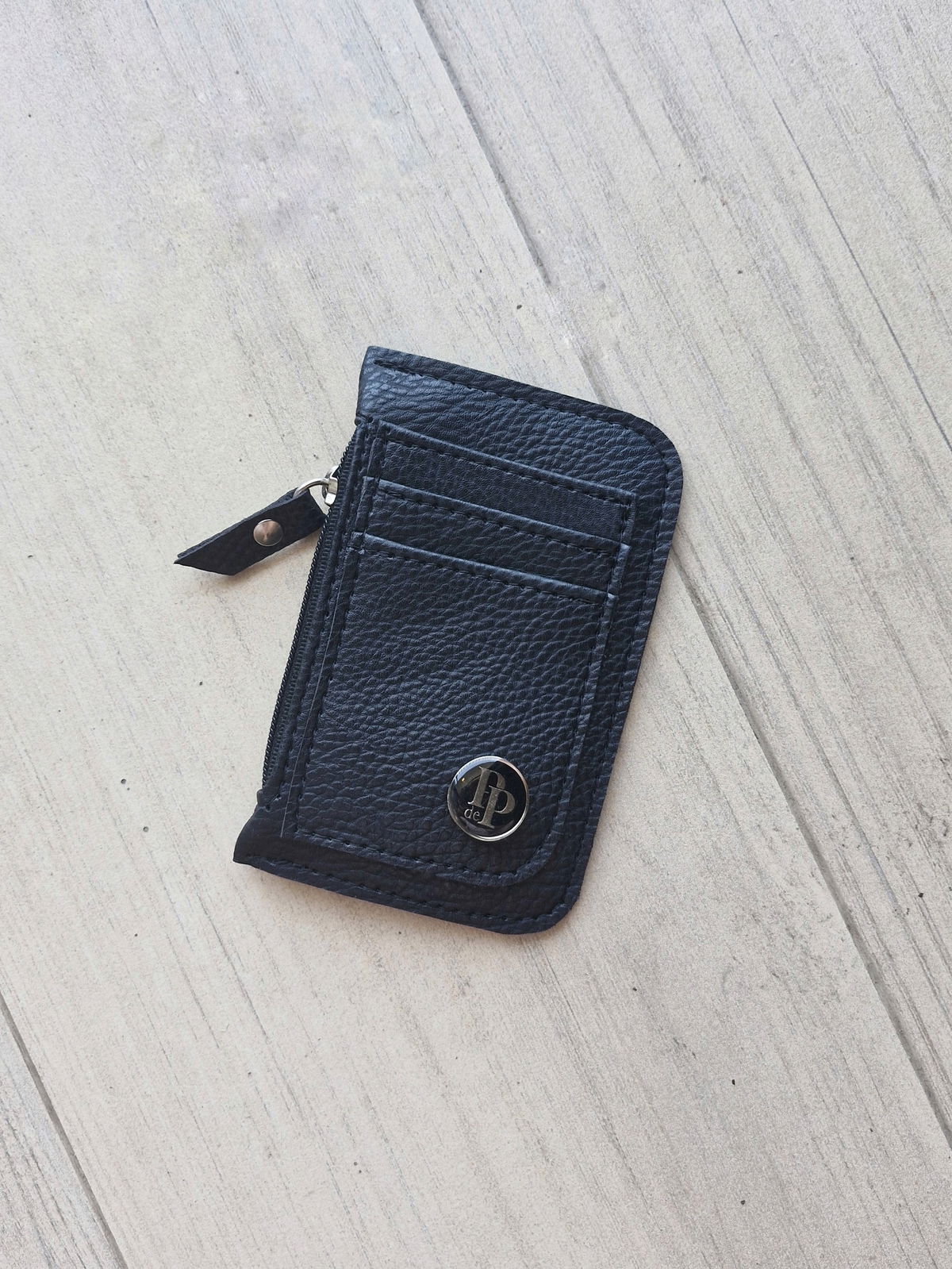 Mide 14 x 9, en el frente tiene espacio para 3 tarjetas, en el dorso un bolsillo para guardar billetes, papeles u otras tarjetas y en el medio una división con cierre para monedas, billetes, etc.