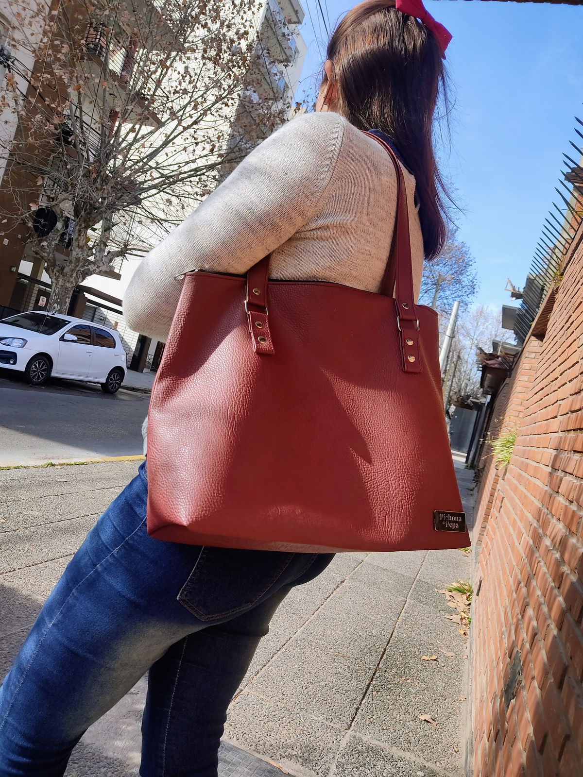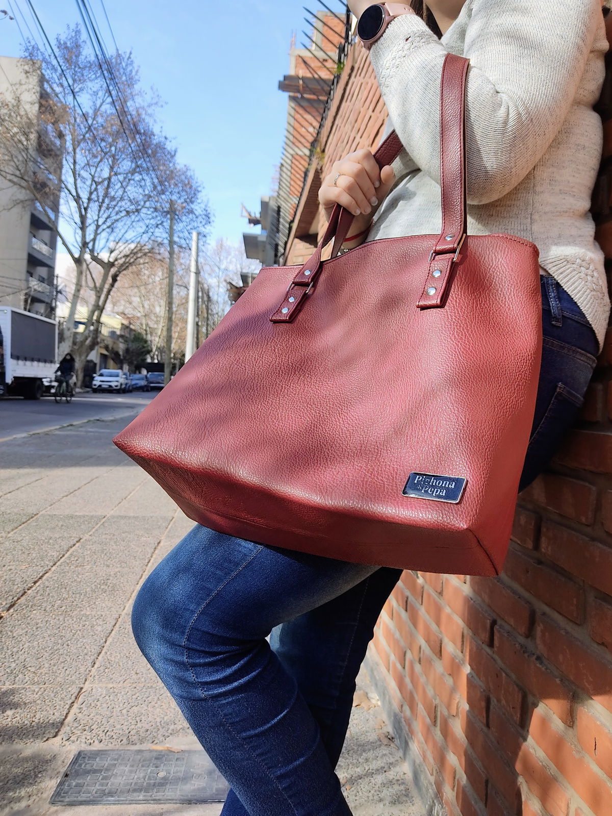 Mide 31 cm de alto por 36 cm de ancho en su base y 39 cm de ancho en su parte superior, con una profundidad de 15 cm. En su interior está completamente forrado y tienen un bolsillo interno de 14 cm de alto por 22 cm de ancho, con una división a los 10 cm (es decir que queda un bolsillo de 10 cm y otro de 12 cm de ancho). Tiene cierre de punta a punta y correas fijas de 60 cm de largo aproximadamente. Es súper espacioso, entran cuadernos A4 y mil cosas más!