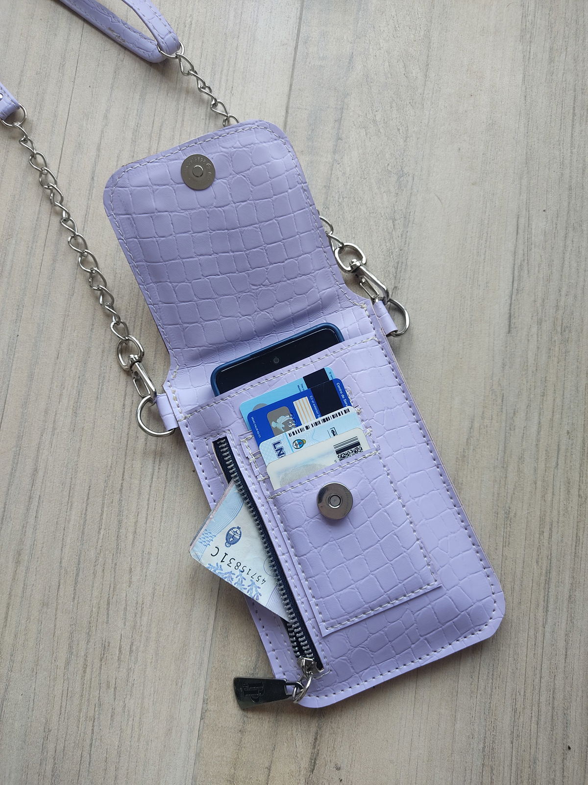 Mide 12,5 cm de ancho por 18 cm de alto (cerrado). Tiene espacio para guardar el ceular, tarjetero para 4 tarjetas y un bolsillo de 15 cm de alto por 12 cm de ancho. El largo de la correa se puede regular y tiene un mosquetón en cada extremo por si querés intercambiarla por otra. En la tapa, a modo de cierre tiene un broche imán.