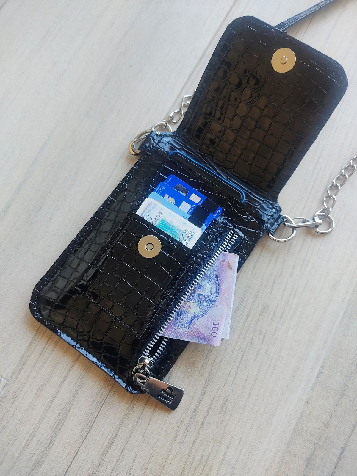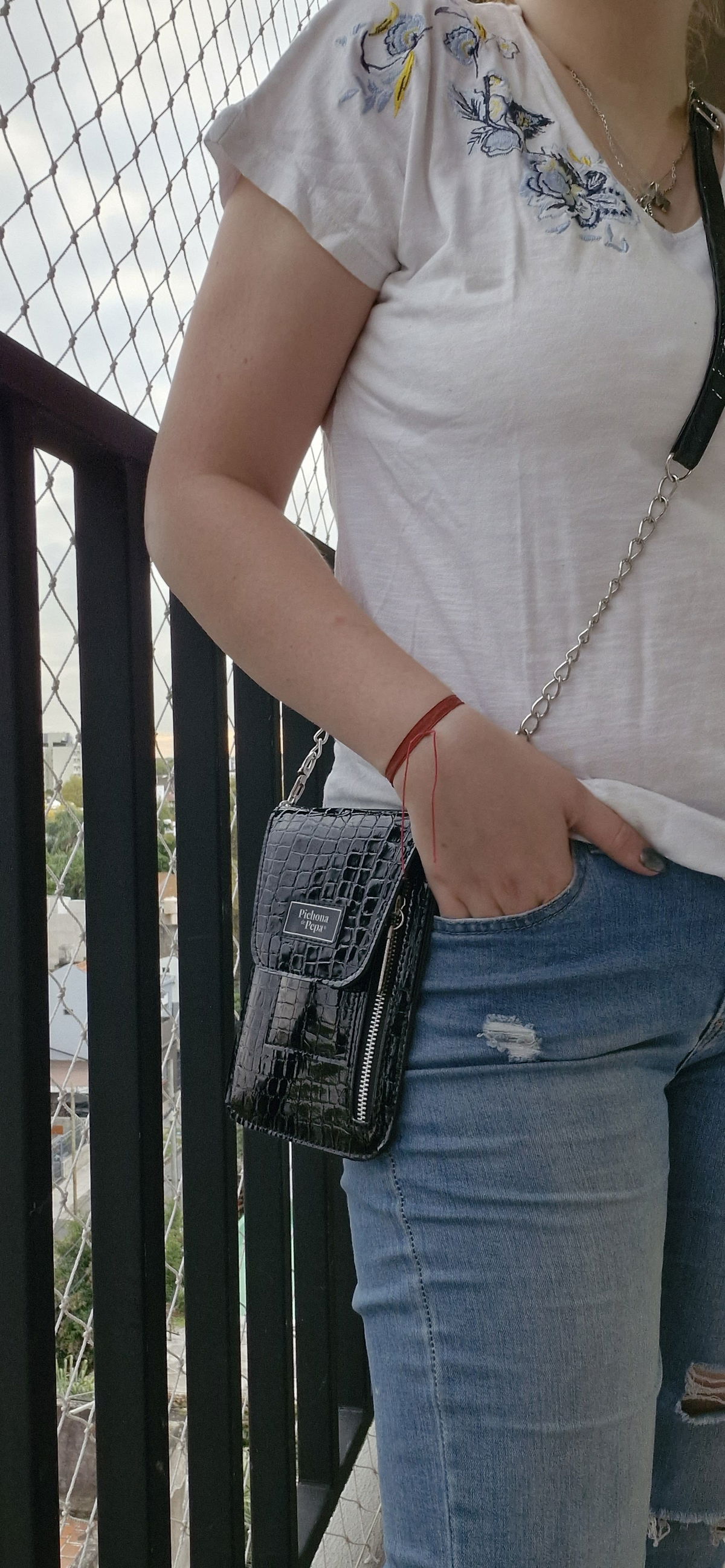 Mide 12,5 cm de ancho por 18 cm de alto (cerrado). Tiene espacio para guardar el ceular, tarjetero para 4 tarjetas y un bolsillo de 15 cm de alto por 12 cm de ancho. El largo de la correa se puede regular y tiene un mosquetón en cada extremo por si querés intercambiarla por otra. En la tapa, a modo de cierre tiene un broche imán.