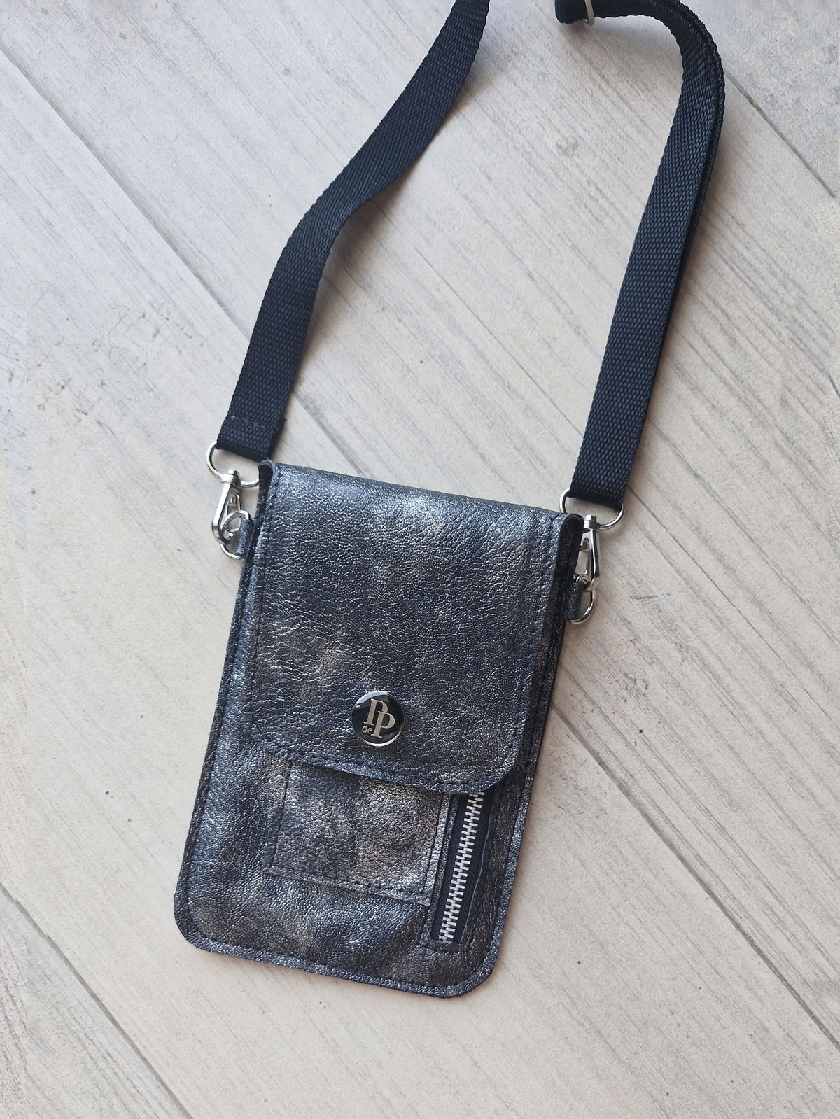 Mide 12,5 cm de ancho por 18 cm de alto (cerrado). Tiene espacio para guardar el ceular, tarjetero para 4 tarjetas y un bolsillo de 15 cm de alto por 12 cm de ancho. El largo de la correa se puede regular y tiene un mosquetón en cada extremo por si querés intercambiarla por otra. En la tapa, a modo de cierre tiene un broche imán.