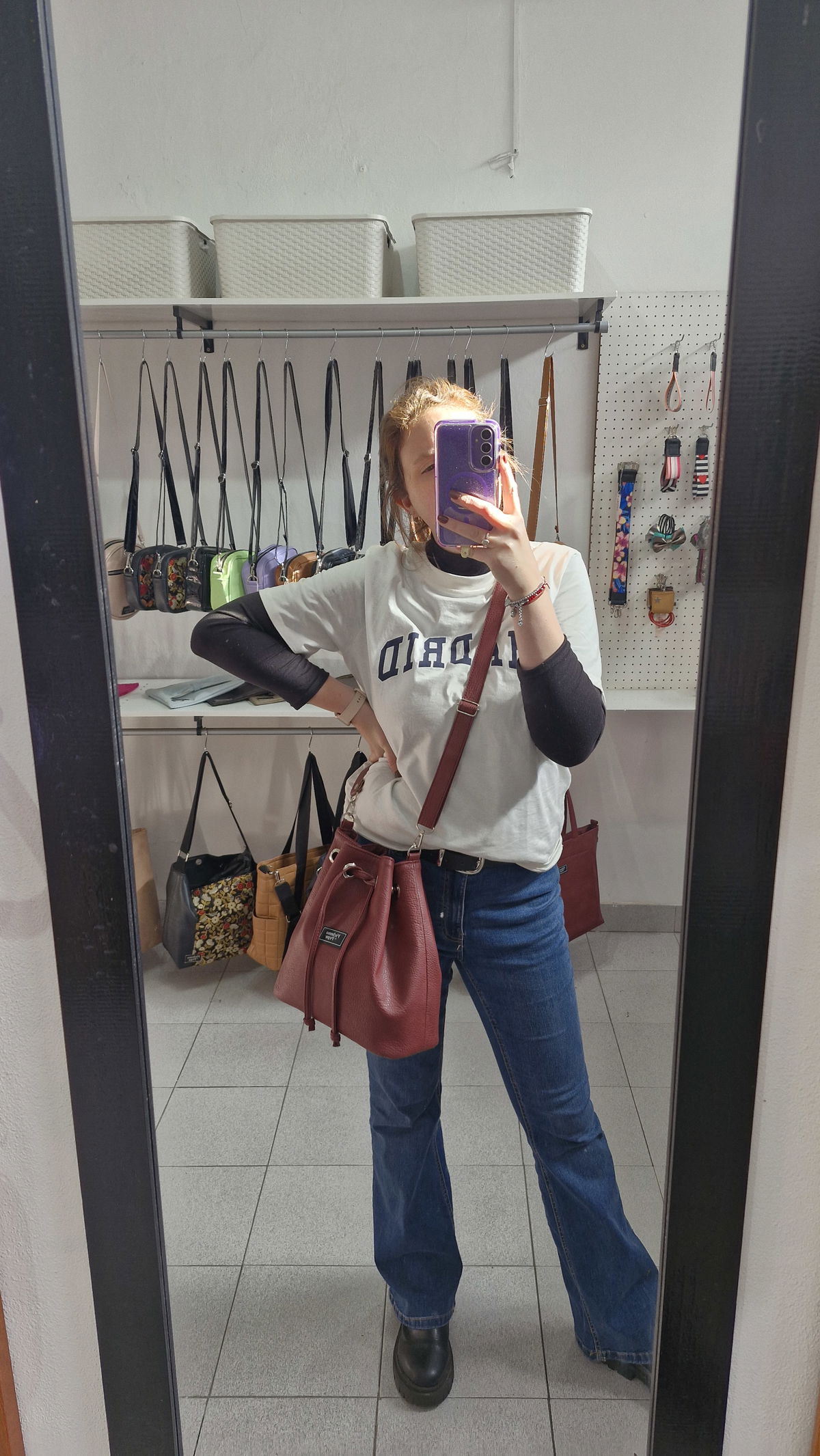 Mide 30 Cm de ancho x 28 Cm de alto x 9 Cm de profundidad, está forrada y tiene un bolsillo interno. Con la correa que pasa por los ojales se puede variar el ajuste del cierre y acomodarlo a lo que haya adentro. Además la correa se puede regular entre 0,75 Cm y 1,30 y tiene un mosquetón en cada extremo para que puedas intercambiarla con otra.