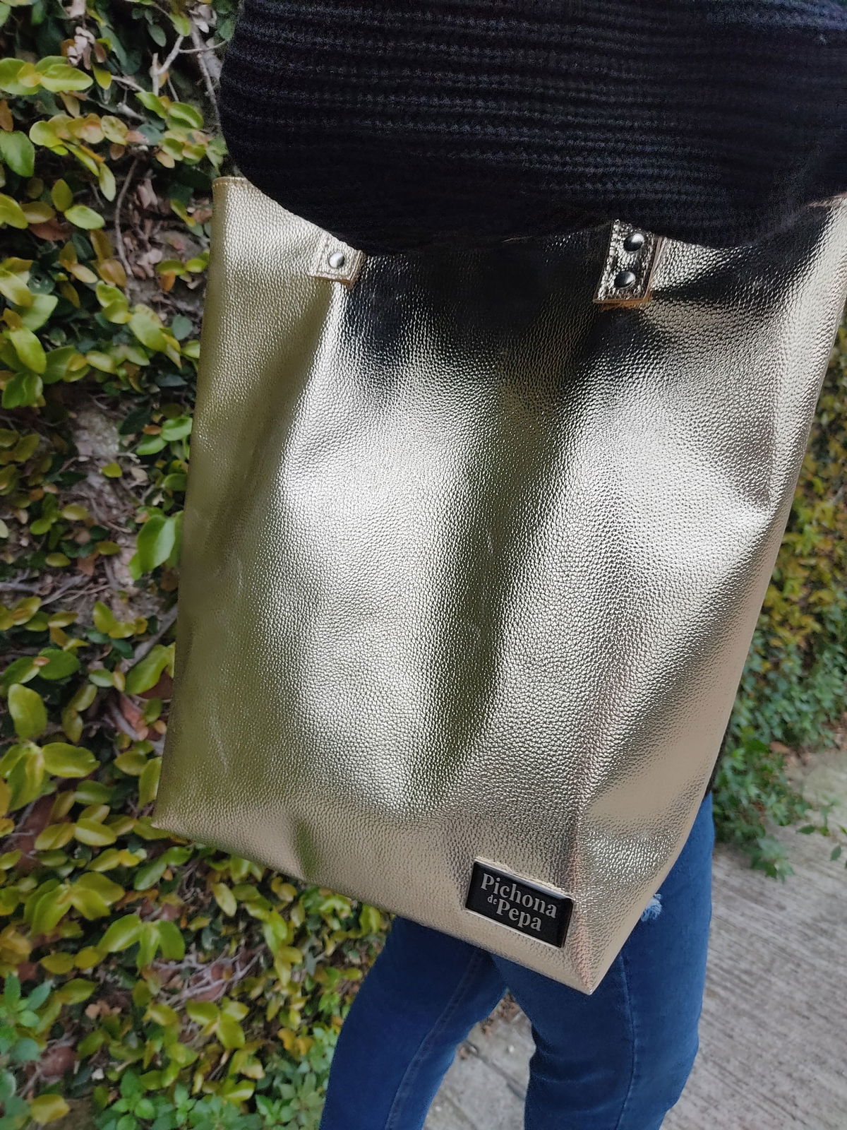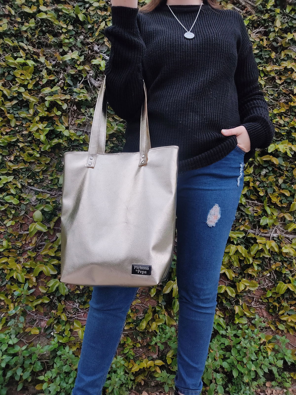 Mide 38 cm de alto por 27 cm de ancho en su base y 38 cm de ancho en su parte superior, con una profundidad de 11 cm. En su interior está completamente forrada y tienen un bolsillo interno de 14 x 12 cm. A modo de cierre tienen un broche imán. Canchera, resistente y súper amplia!