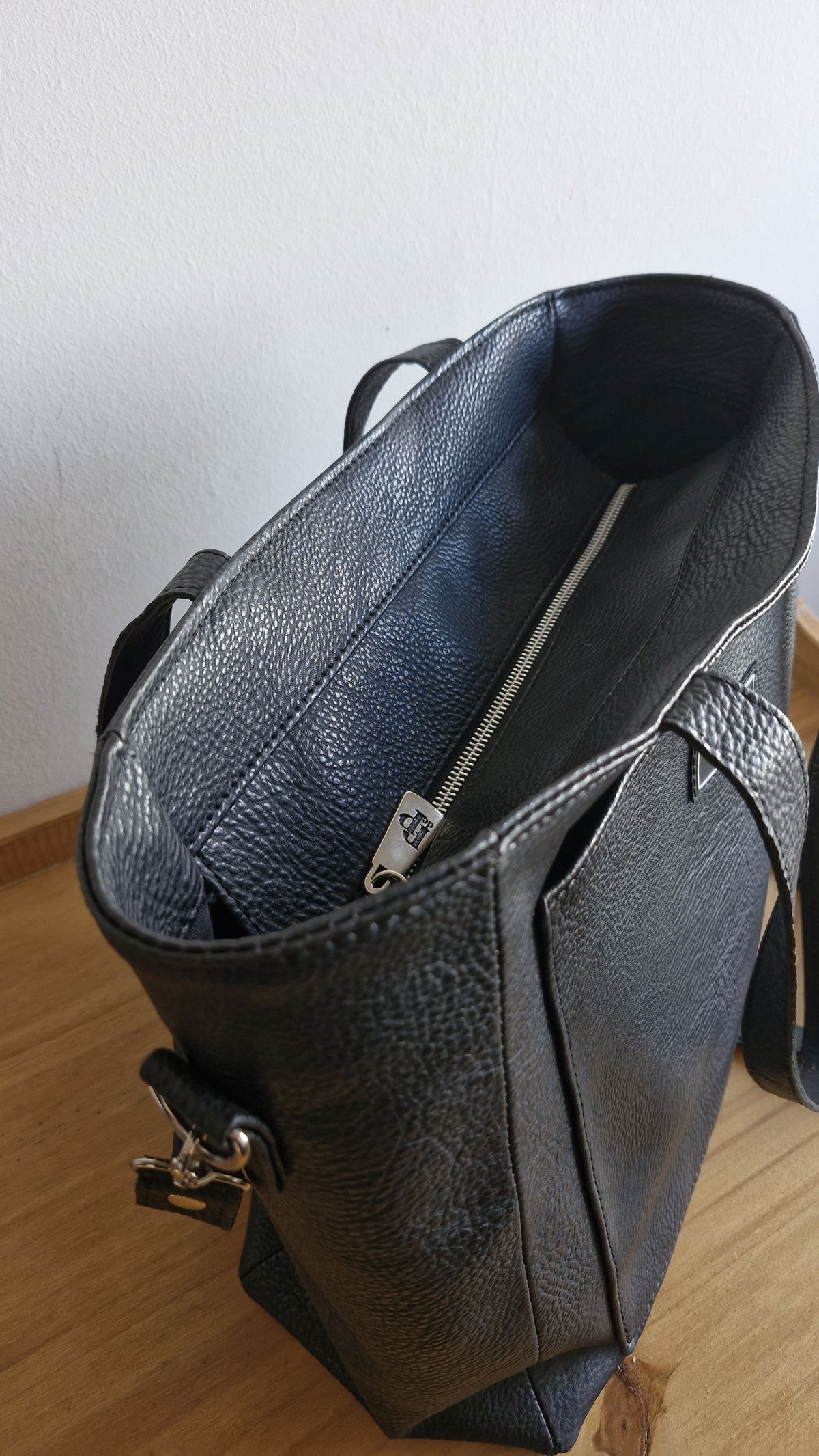 Mide 30 cm de alto por 33 cm de ancho en su base y 44 cm de ancho en su parte superior, con una profundidad de 13 cm. Esta completamente forrada, el compartimiento principal tiene cierre y en su interior cuenta con un bolsillo de 20 x 14 cm. En el frente tiene otro bolsillo de 26 cm x23 cm con un broche imán a modo de cierre. Las correas de hombro tienen 60 cm de largo y adicionalmente viene con una correa larga desmontable cuyo largo se puede regular entre 70 cm y 1,30.