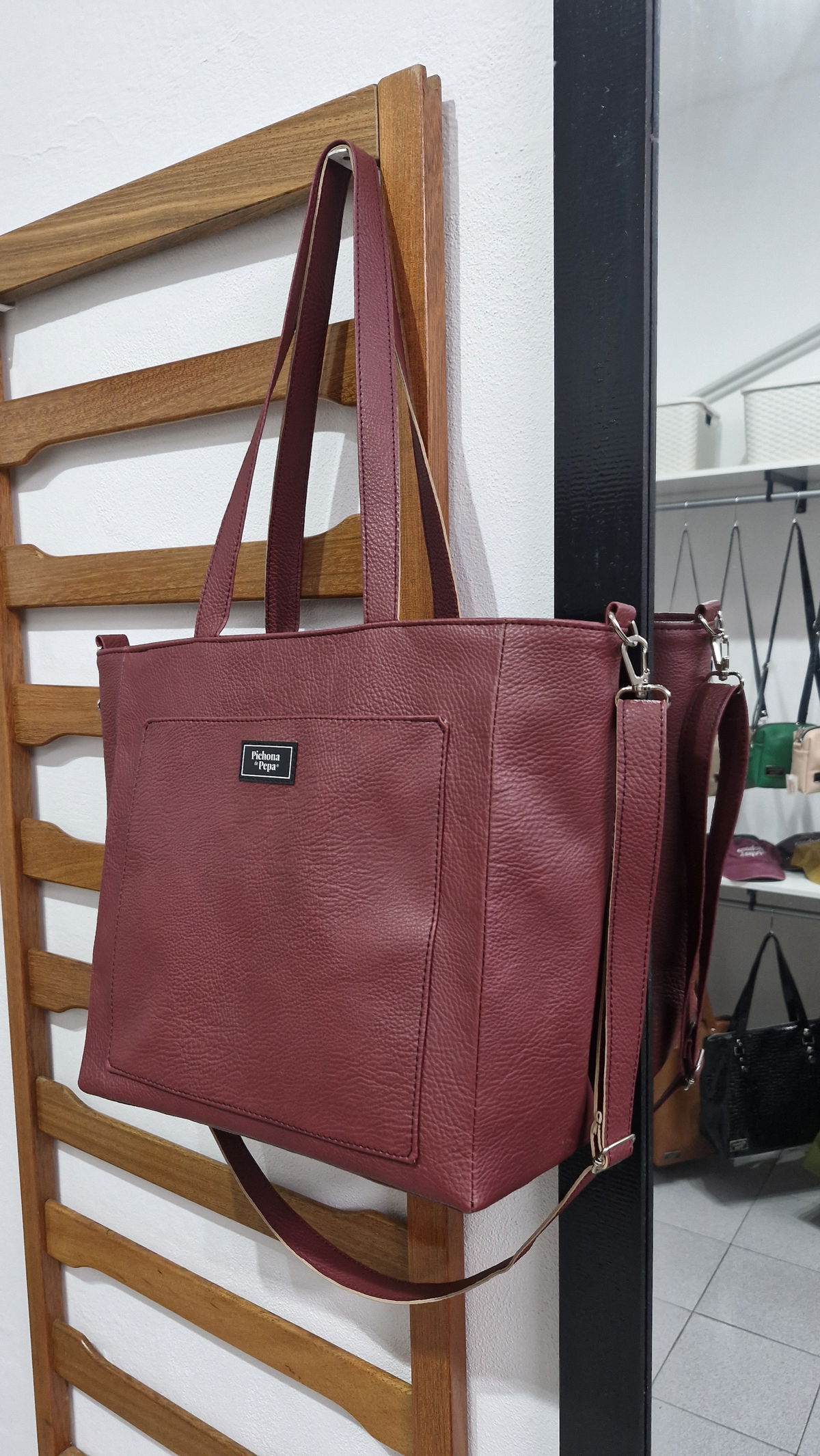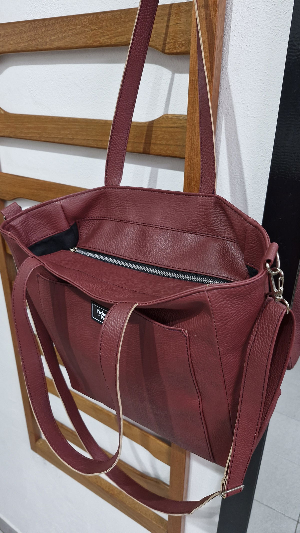 Mide 30 cm de alto por 33 cm de ancho en su base y 44 cm de ancho en su parte superior, con una profundidad de 13 cm. Esta completamente forrada, el compartimiento principal tiene cierre y en su interior cuenta con un bolsillo de 20 x 14 cm. En el frente tiene otro bolsillo de 26 cm x23 cm con un broche imán a modo de cierre. Las correas de hombro tienen 60 cm de largo y adicionalmente viene con una correa larga desmontable cuyo largo se puede regular entre 70 cm y 1,30.