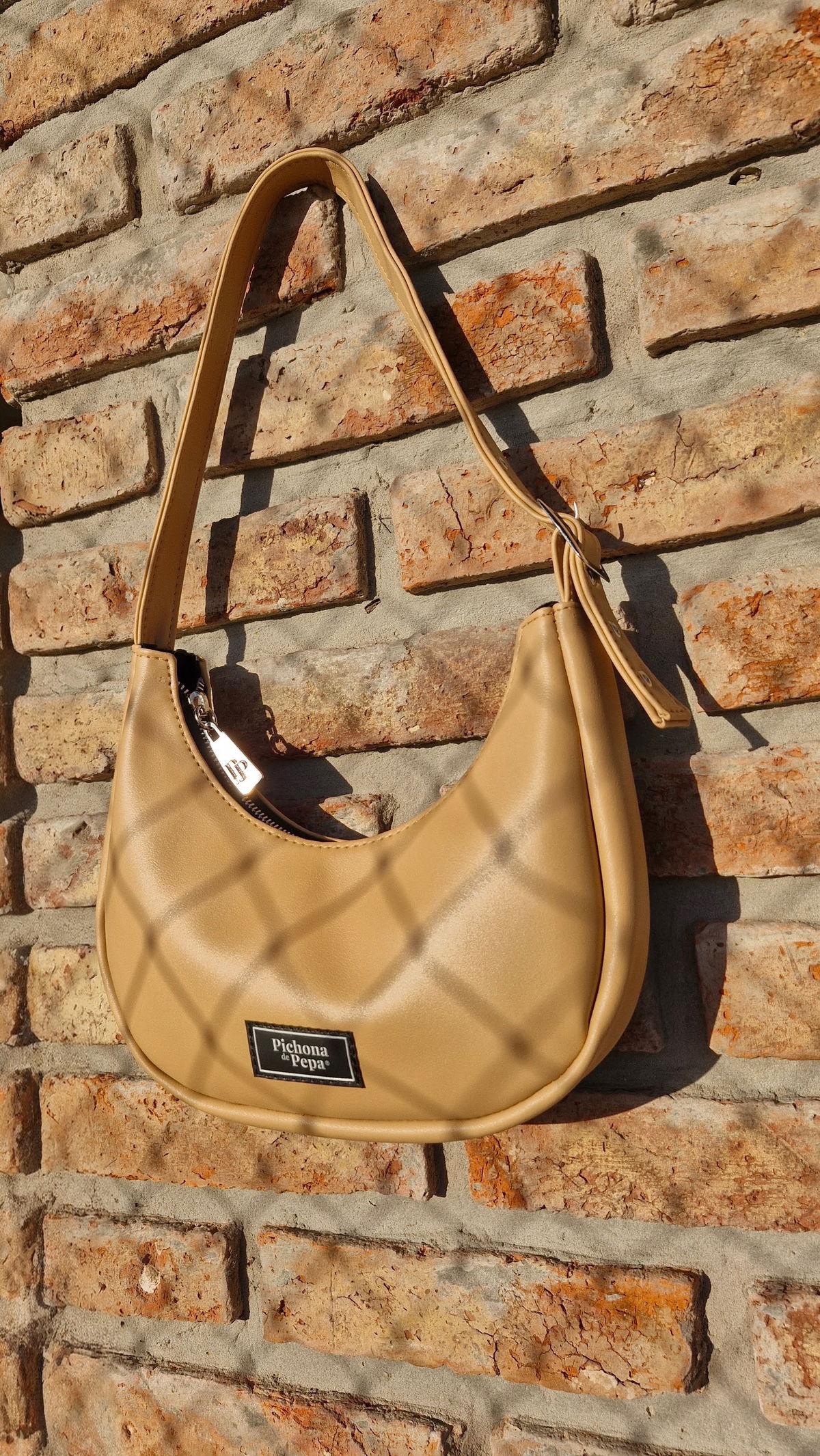 Mide 26 cm de ancho por 13 cm de alto, con una profundidad de 6 cm. Esta completamente forrada, tiene un único compartimento con cierre de punta a punta. La correa mide 60 cm y tiene ojales para regular su largo.