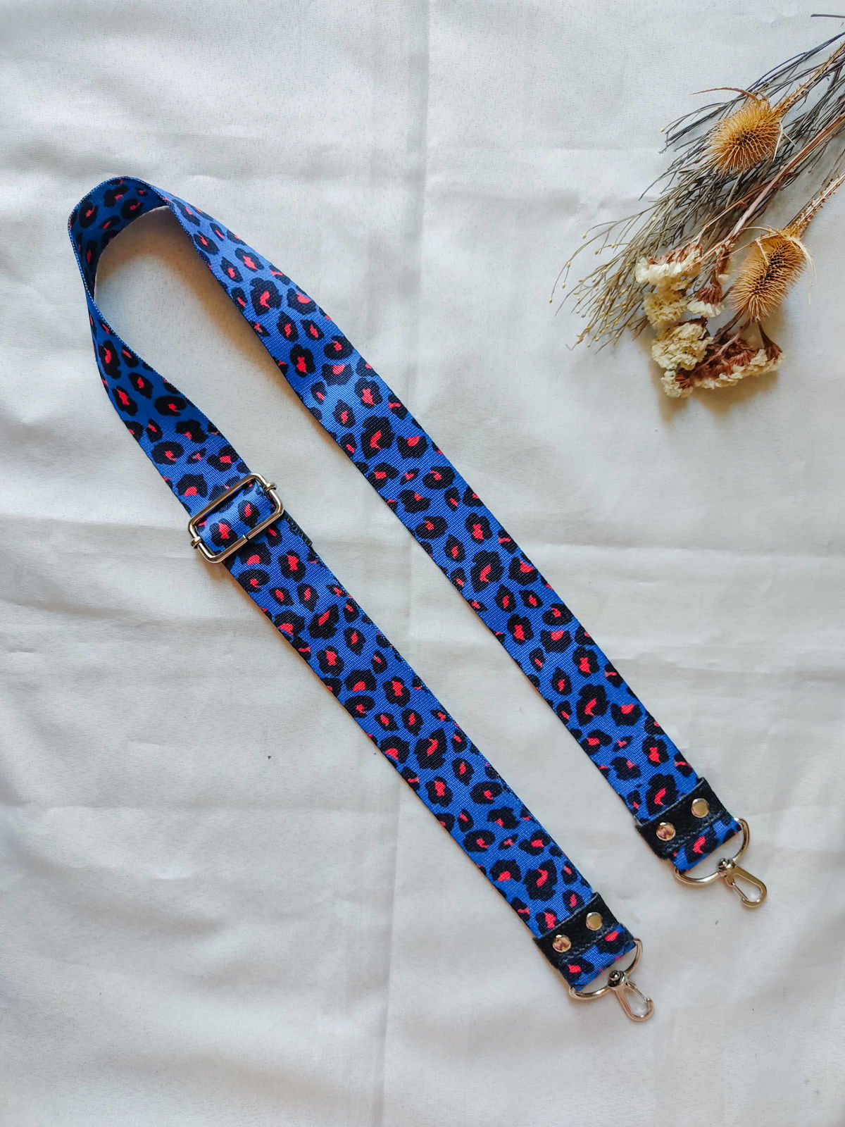 Mide 4 Cm de ancho, y al tener regulador, el largo se puede variar entre 0,75 Cm y 1,30. En cada extremo tiene un mosquetón para que puedas intercambiarlas con tus carteras y darles otra onda. Todos los herrajes son color níquel.