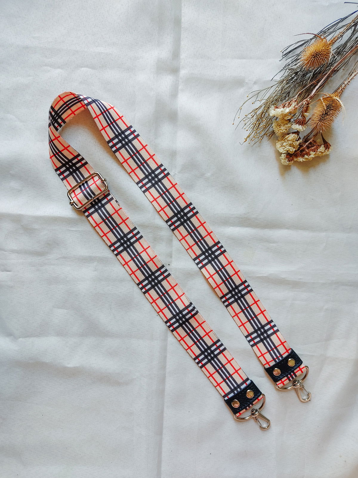 Mide 4 Cm de ancho, y al tener regulador, el largo se puede variar entre 0,75 Cm y 1,30. En cada extremo tiene un mosquetón para que puedas intercambiarlas con tus carteras y darles otra onda. Todos los herrajes son color níquel.