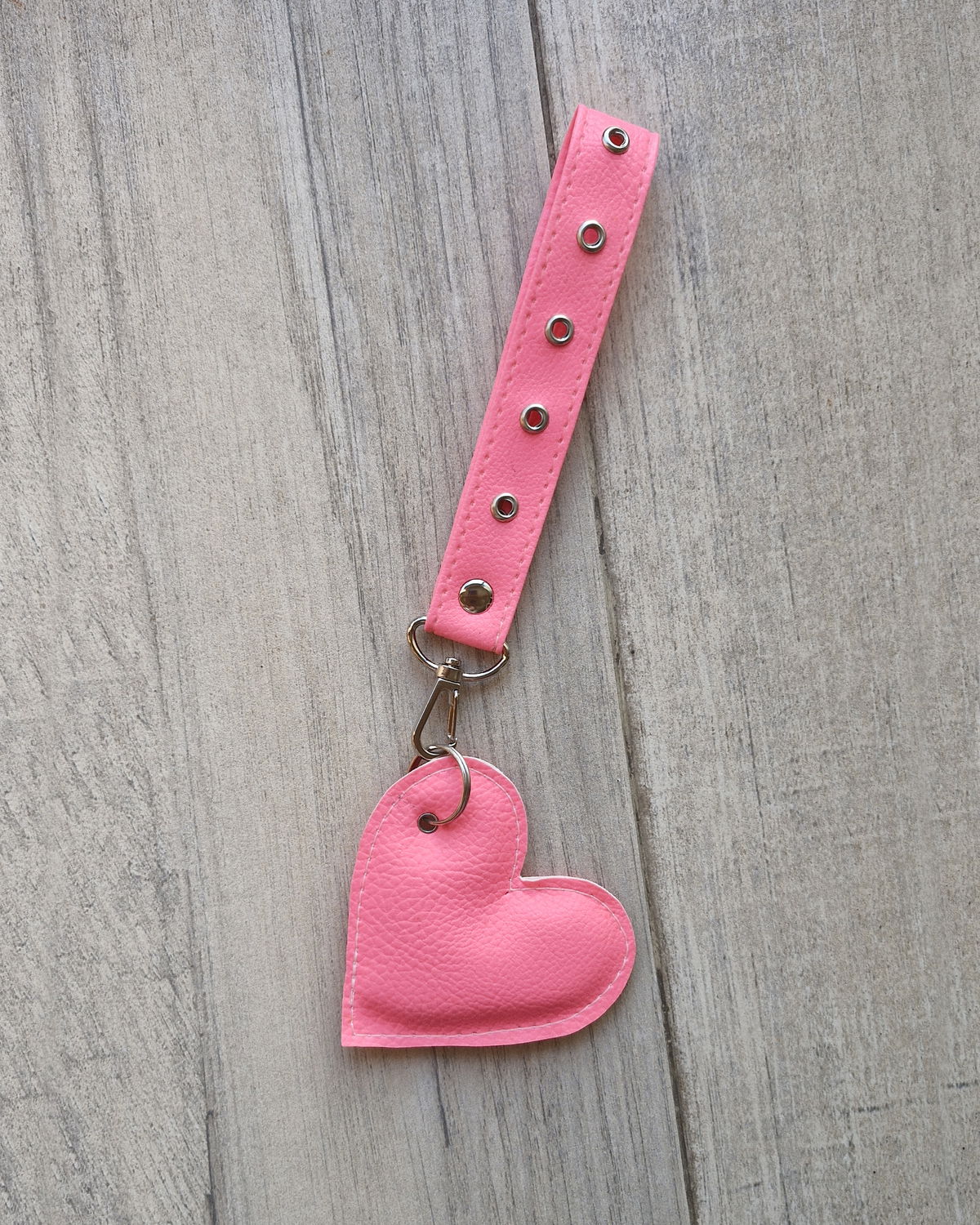 El corazón mide 8 cm aprox y tiene una argolla de llavero. La correa 16 cm. de largo. y tiene un mosquetón. Podes usarlos juntos o por separado.