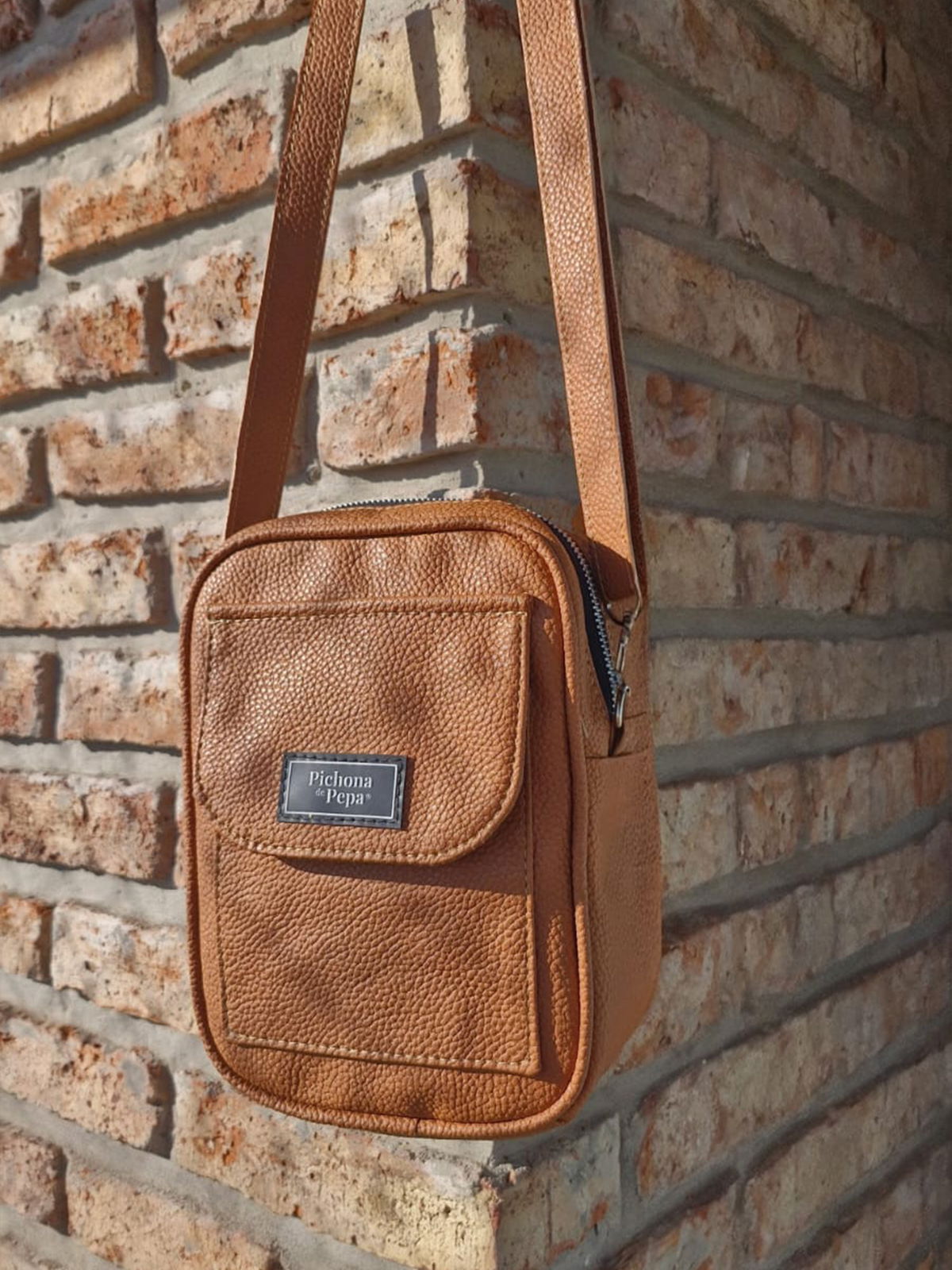 Mide 24 cm de alto por 18 cm de ancho y tiene una profundidad de 6.5 cm. Esta completamente forrada y el compartimiento principal tiene cierre. En el frente tiene un bolsillo con tapa de 14 cm x 13 cm y en la parte posterior, otro bolsillo de 13 cm x 14 cm con cierre. La correa es desmontable y su largo se puede regular entre 70 cm y 1,30.