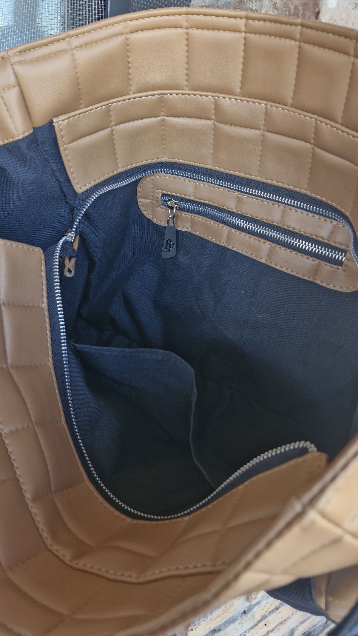 Tiene un compartimento principal, con cierre de aluminio y en el interior hay un bolsillo con cierre de 20 cm de ancho por 14 cm de alto y otro sin cierre de 20 cm de ancho por 14 cm de alto.