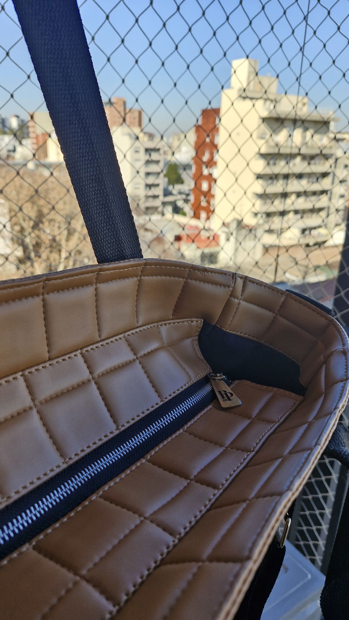Del lado exterior, en cada lateral tiene un bolsillo de 14 cm de ancho por 16 cm de alto.