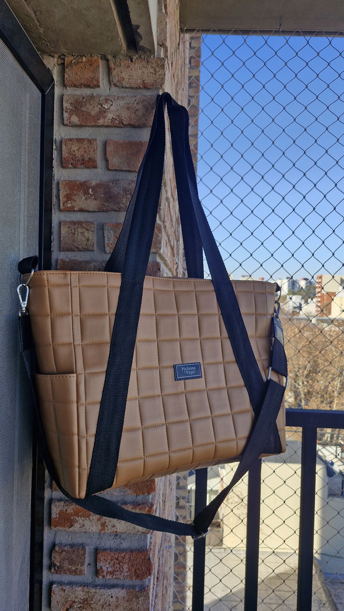 Mide 35 cm de ancho x 30 cm de alto x 14 cm de profundidad y está confeccionada en tela acolchonada.