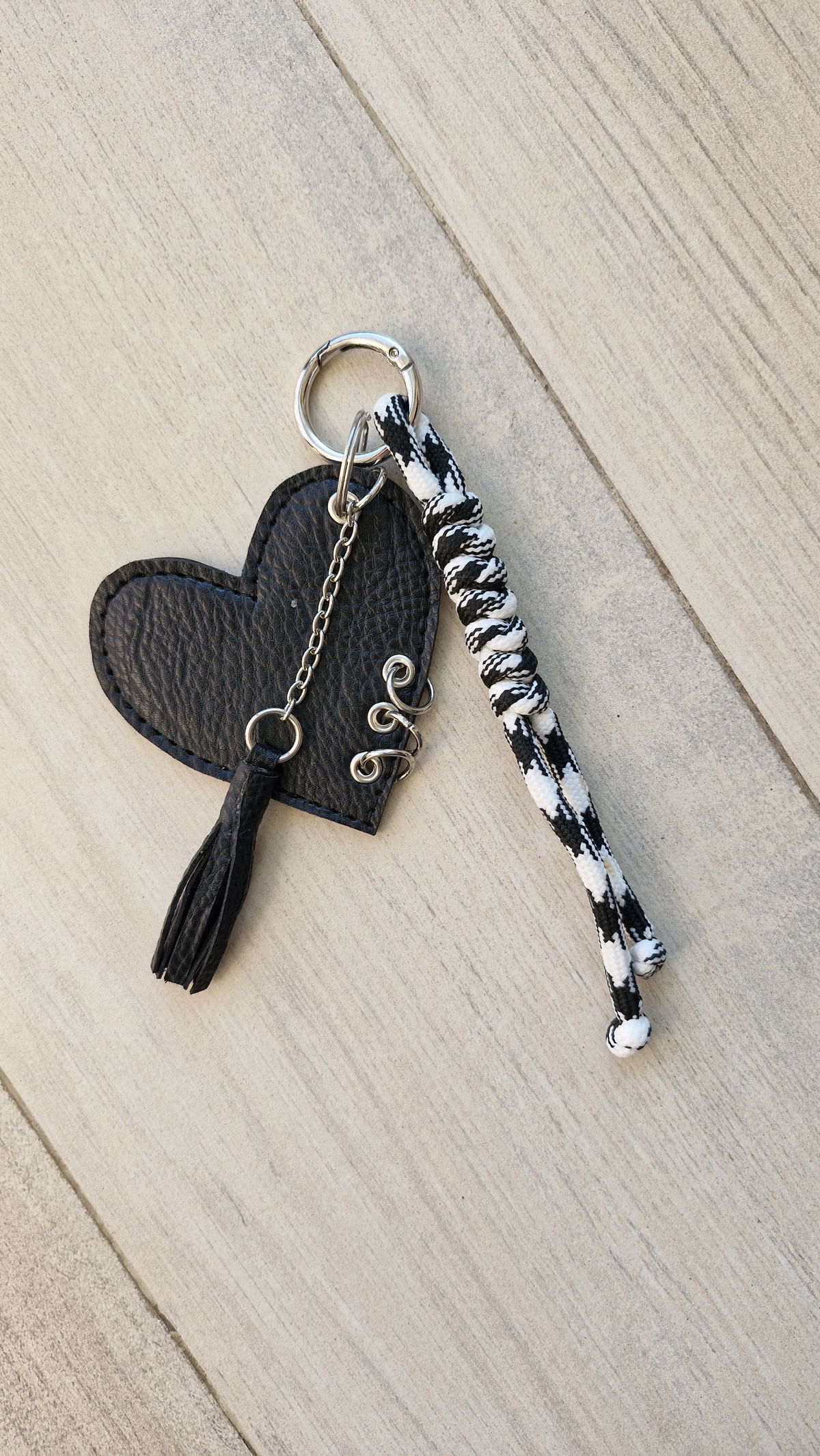Llavero corazón negro arandelas, flecos y cordón
