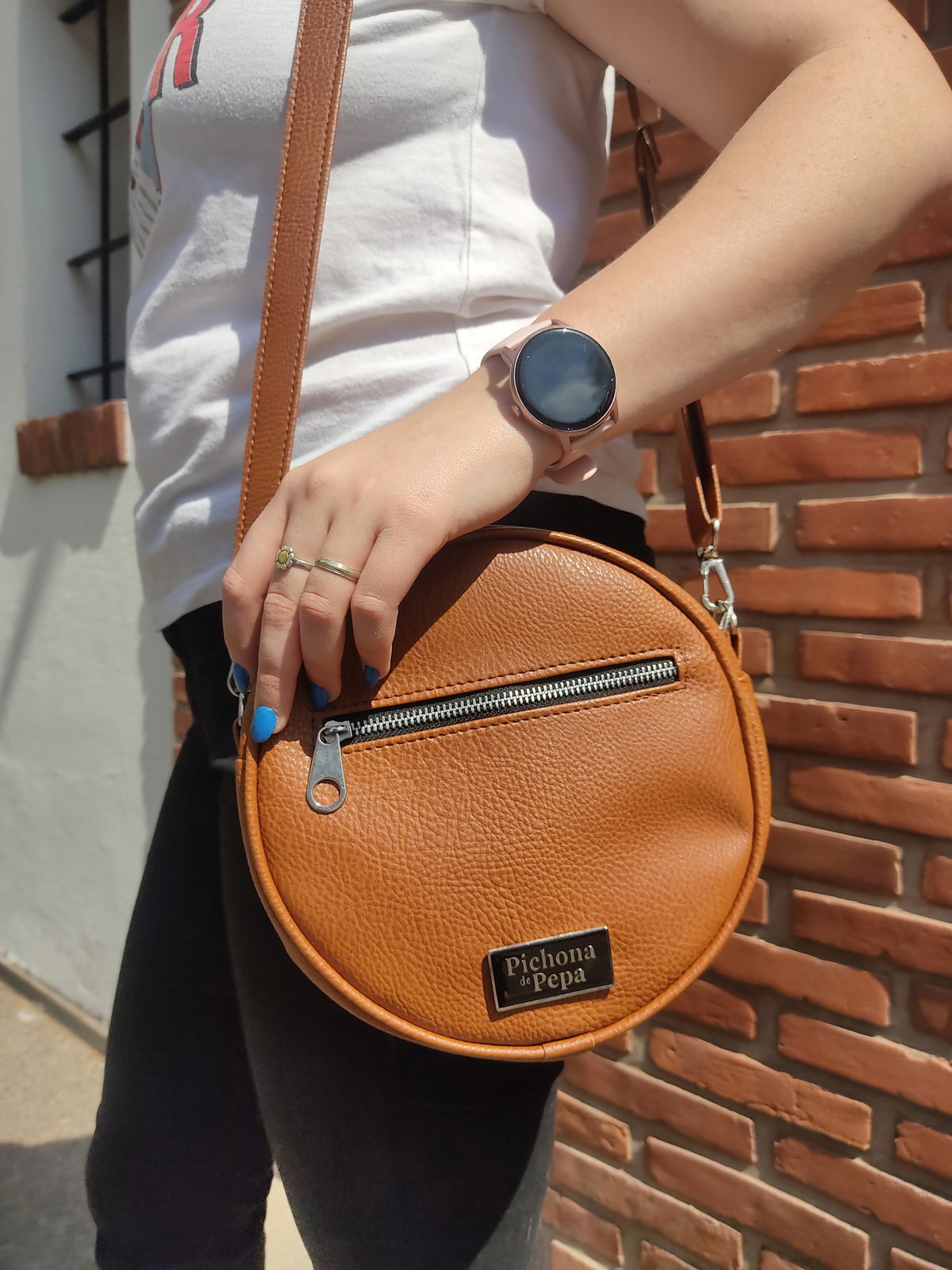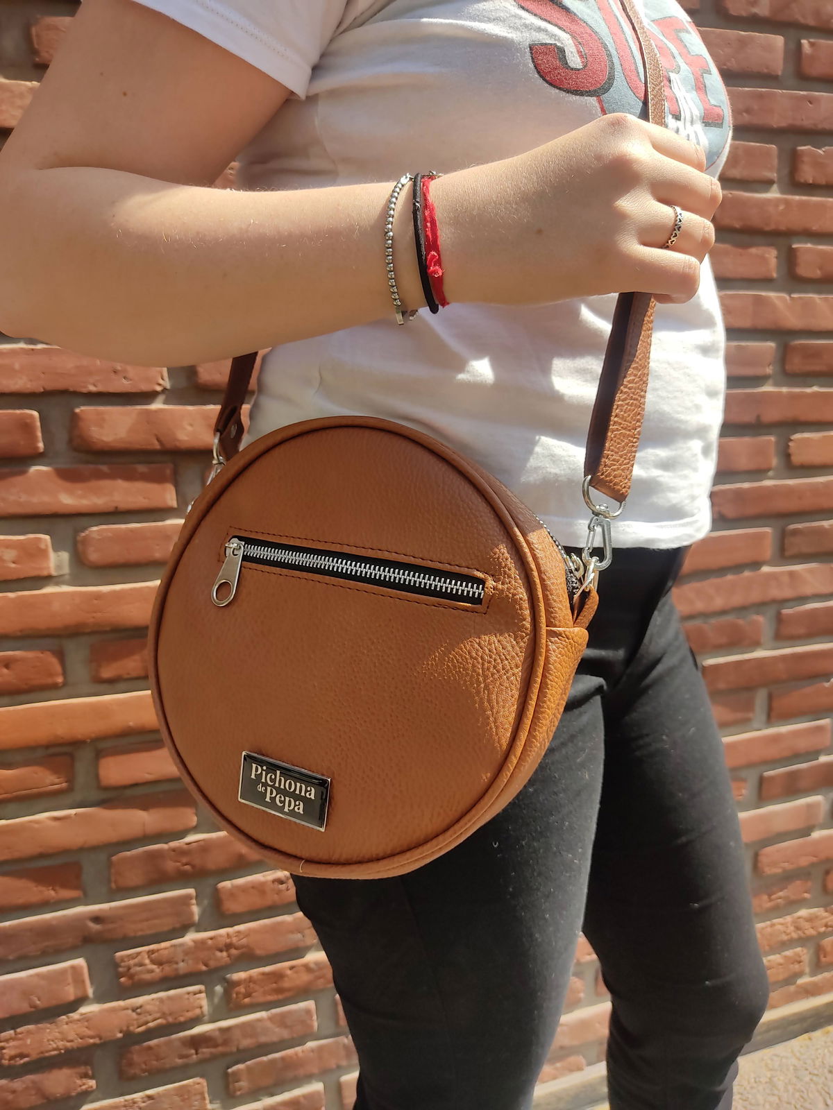 Mide 22 cm de diámetro y tiene una profundidad de 6 cm. Está completamente forrada, tiene un compartimento principal con cierre metálico y un bolsillo en la parte del frente, también con cierre. Trae una correa regulable entre 75 cm y 1.30 mts, con un mosquetón en cada extremo para que puedas intercambiarla con otras.