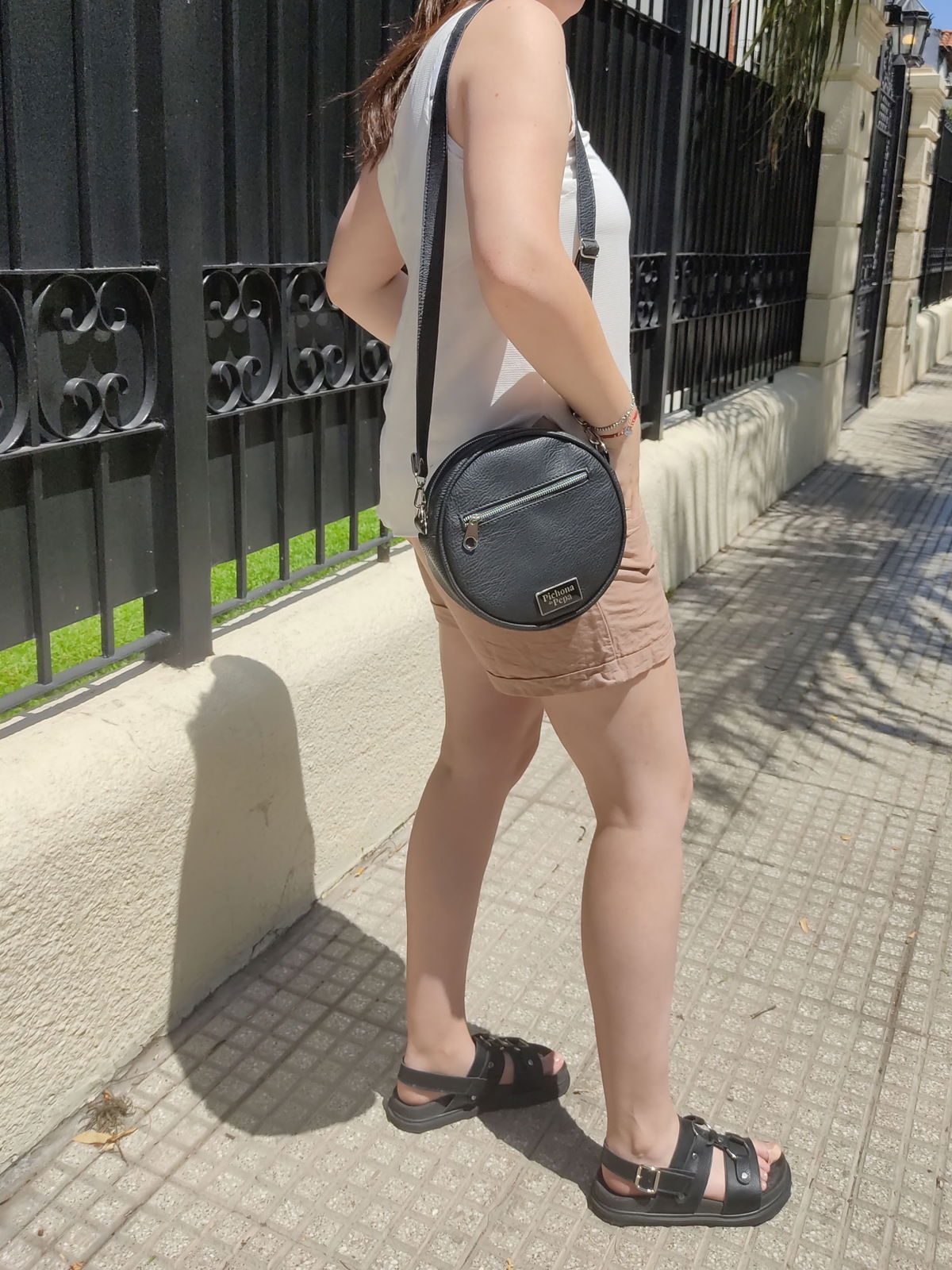 Mide 22 cm de diámetro y tiene una profundidad de 6 cm. Está completamente forrada, tiene un compartimento principal con cierre metálico y un bolsillo en la parte del frente, también con cierre. Trae una correa regulable entre 75 cm y 1.30 mts, con un mosquetón en cada extremo para que puedas intercambiarla con otras.