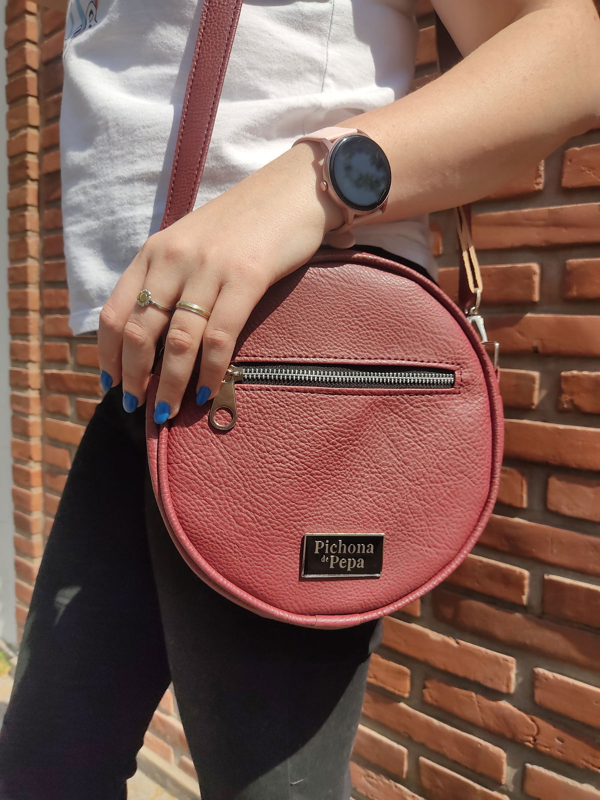 Mide 22 cm de diámetro y tiene una profundidad de 6 cm. Está completamente forrada, tiene un compartimento principal con cierre metálico y un bolsillo en la parte del frente, también con cierre. Trae una correa regulable entre 75 cm y 1.30 mts, con un mosquetón en cada extremo para que puedas intercambiarla con otras.