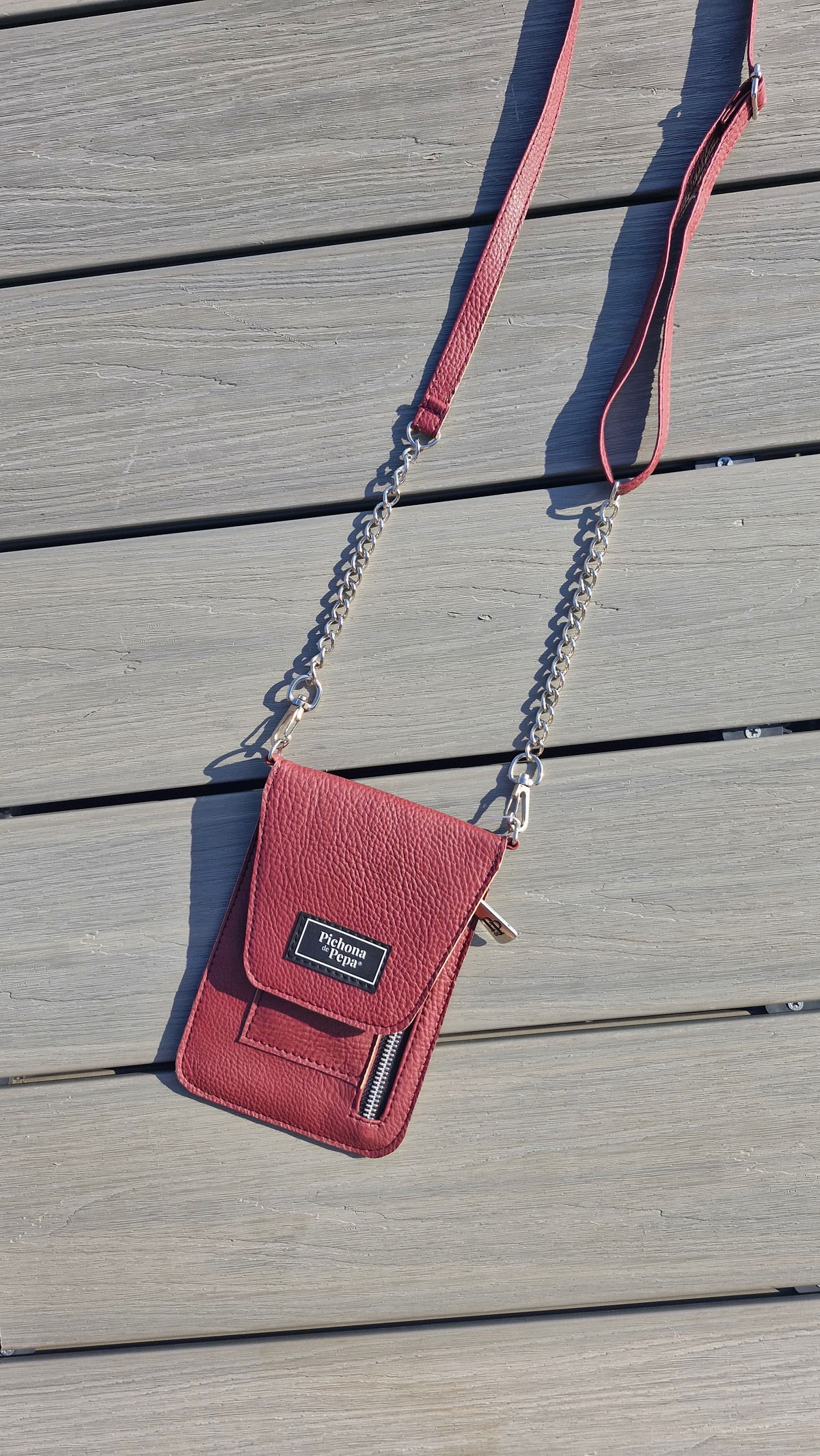 Mide 12,5 cm de ancho por 18 cm de alto (cerrado). Tiene espacio para guardar el ceular, tarjetero para 4 tarjetas y un bolsillo de 15 cm de alto por 12 cm de ancho. El largo de la correa se puede regular y tiene un mosquetón en cada extremo por si querés intercambiarla por otra. En la tapa, a modo de cierre tiene un broche imán.