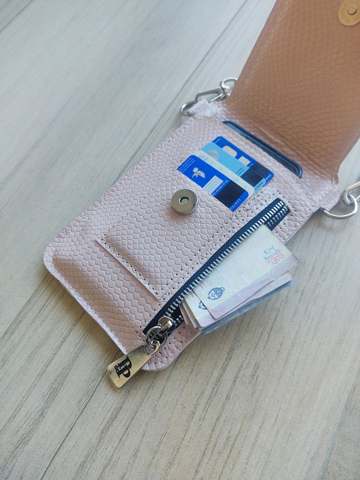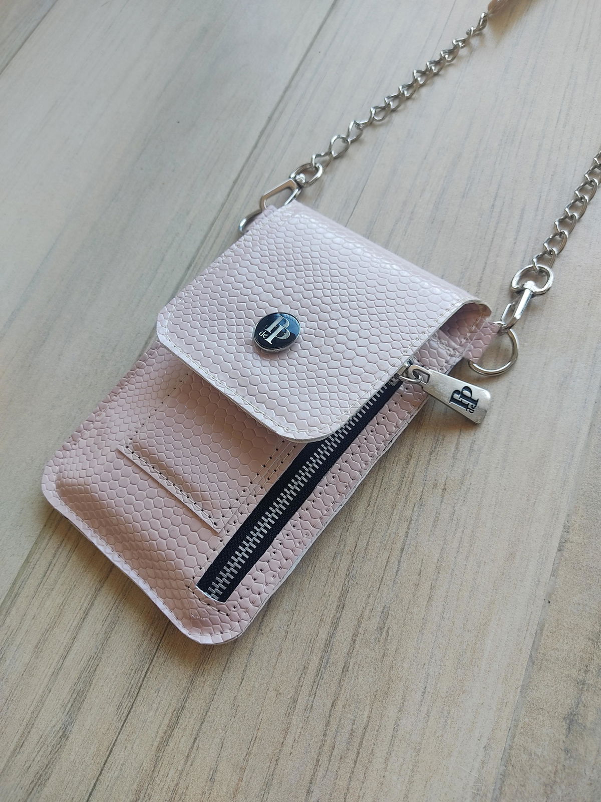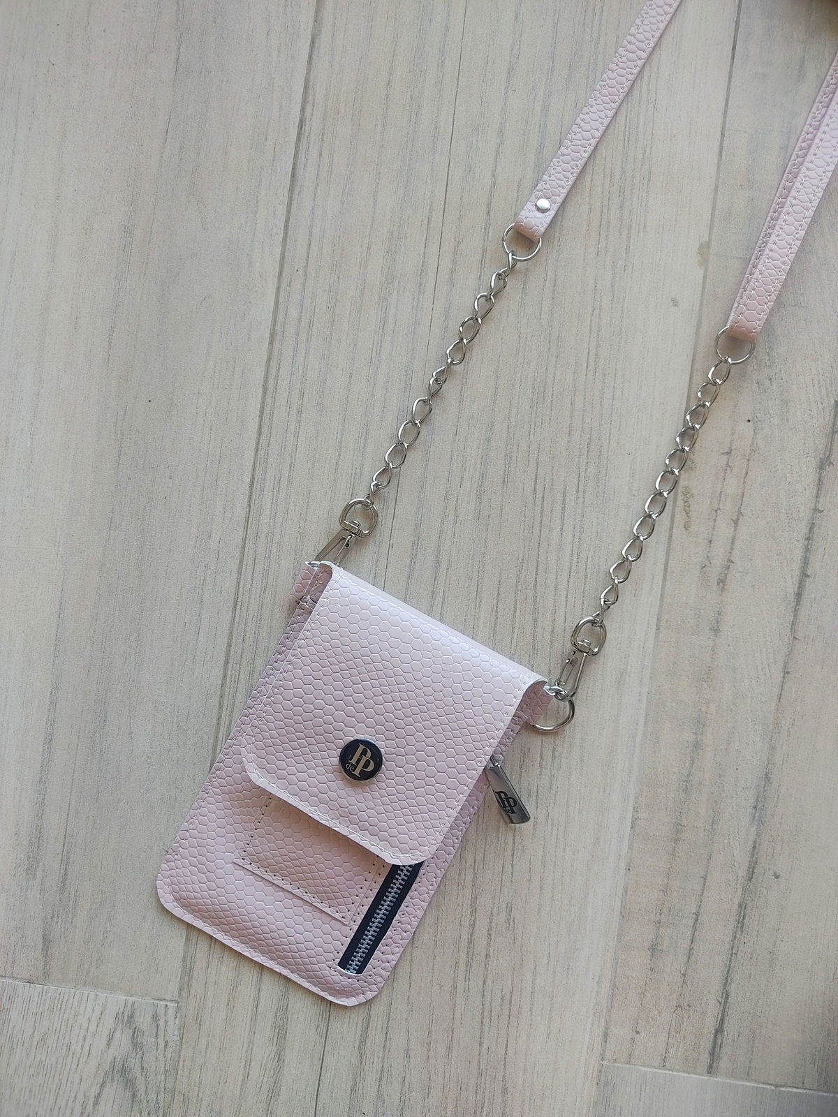 Mide 12,5 cm de ancho por 18 cm de alto (cerrado). Tiene espacio para guardar el ceular, tarjetero para 4 tarjetas y un bolsillo de 15 cm de alto por 12 cm de ancho. El largo de la correa se puede regular y tiene un mosquetón en cada extremo por si querés intercambiarla por otra. En la tapa, a modo de cierre tiene un broche imán.
