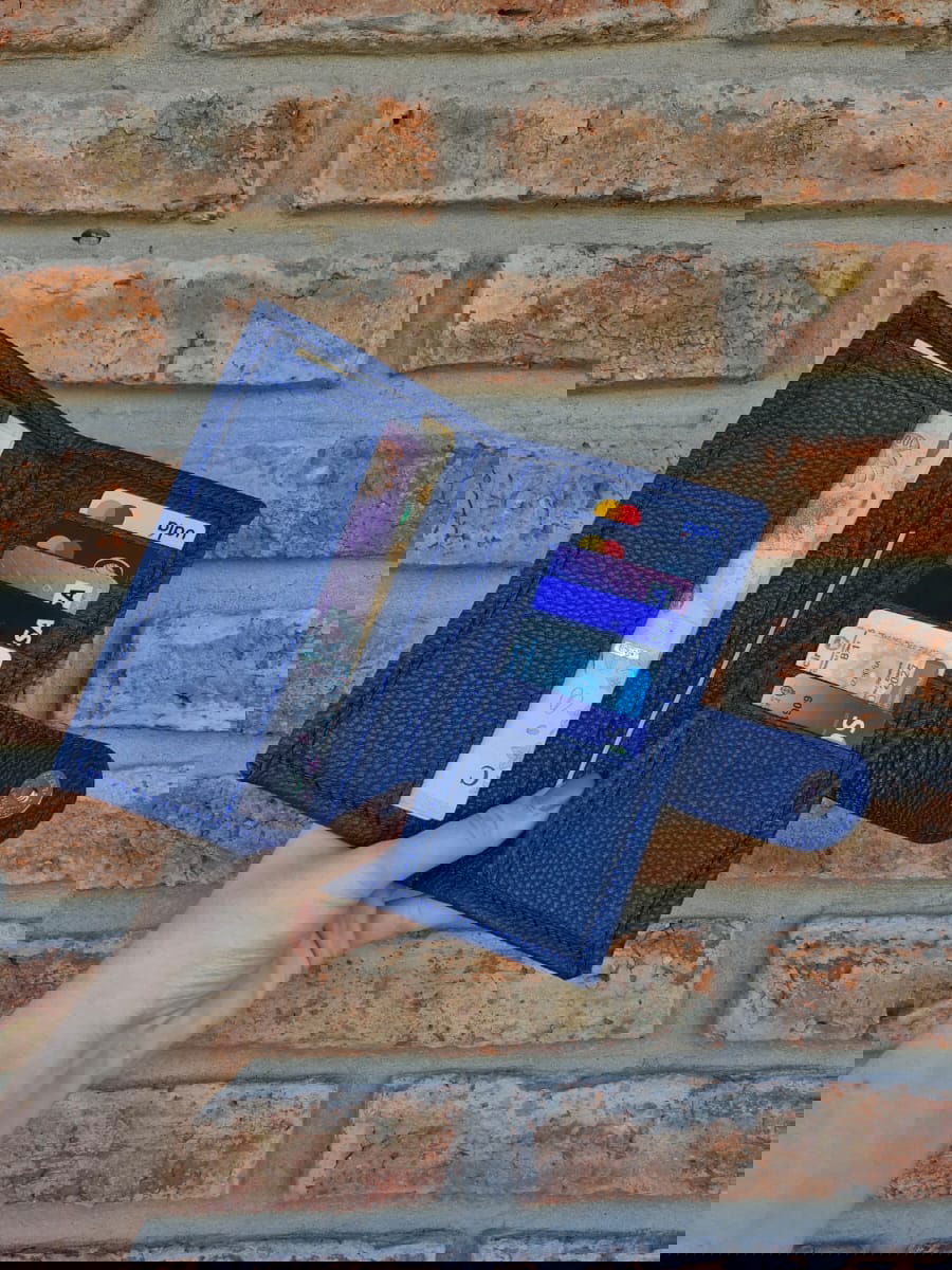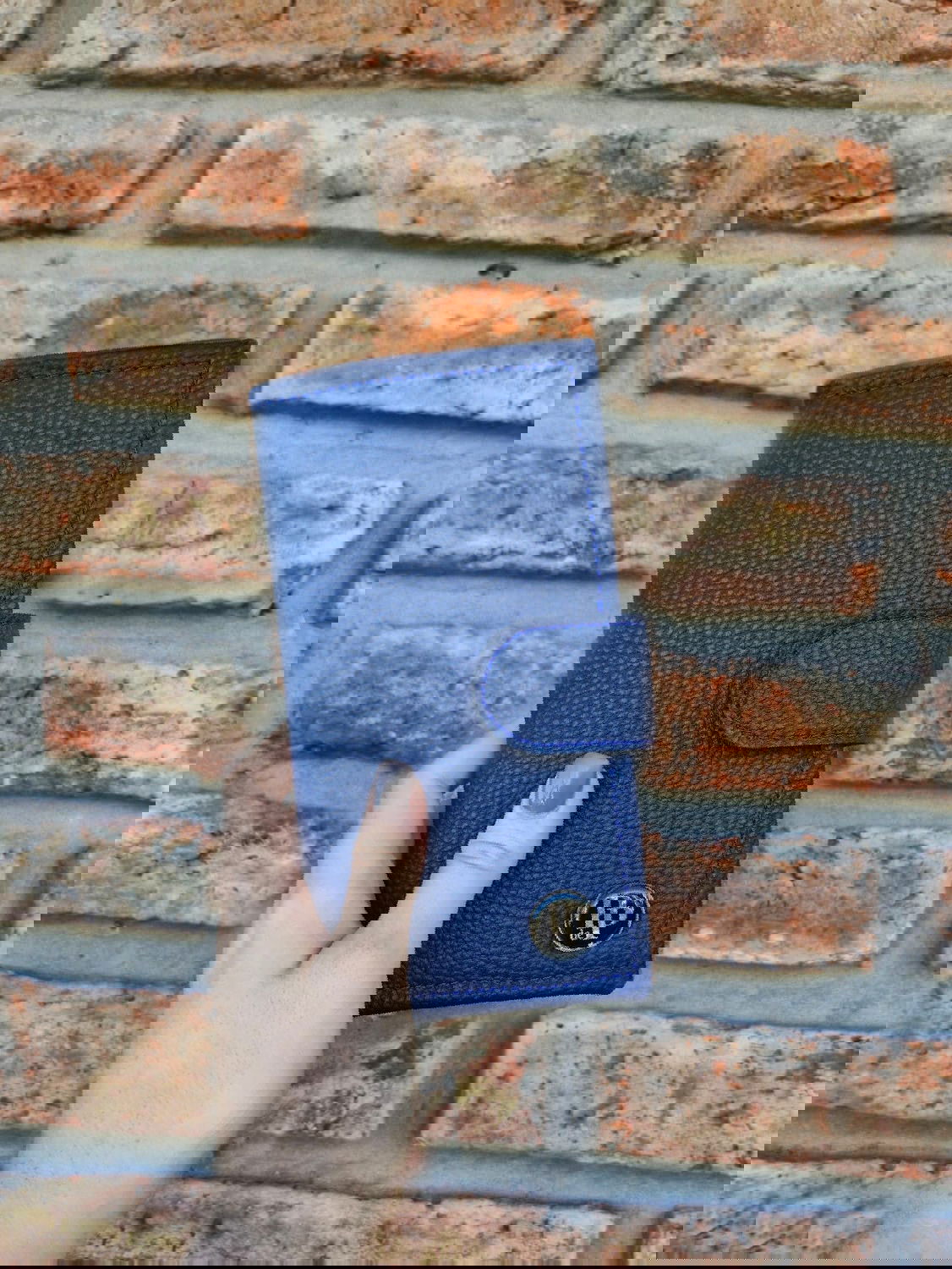 Mide 10,5 x 19,5 cerrada y 21 x 19,5 abierta. Del lado izquierdo tiene 2 solapas para billetes y un bolsillo de 9 cm de ancho. Del lado derecho tiene espacio para 7 tarjetas, un bolsillo de 7,5 cm de ancho y otro de 9 cm de ancho. A modo de cierre lleva una tira con un broche imán.