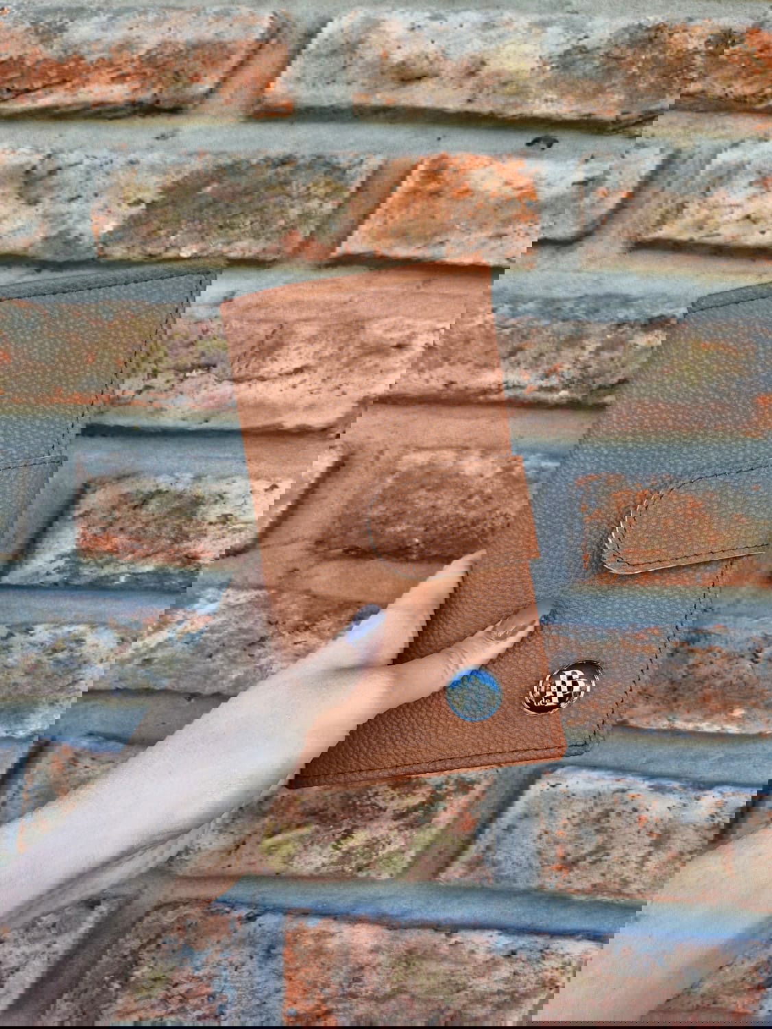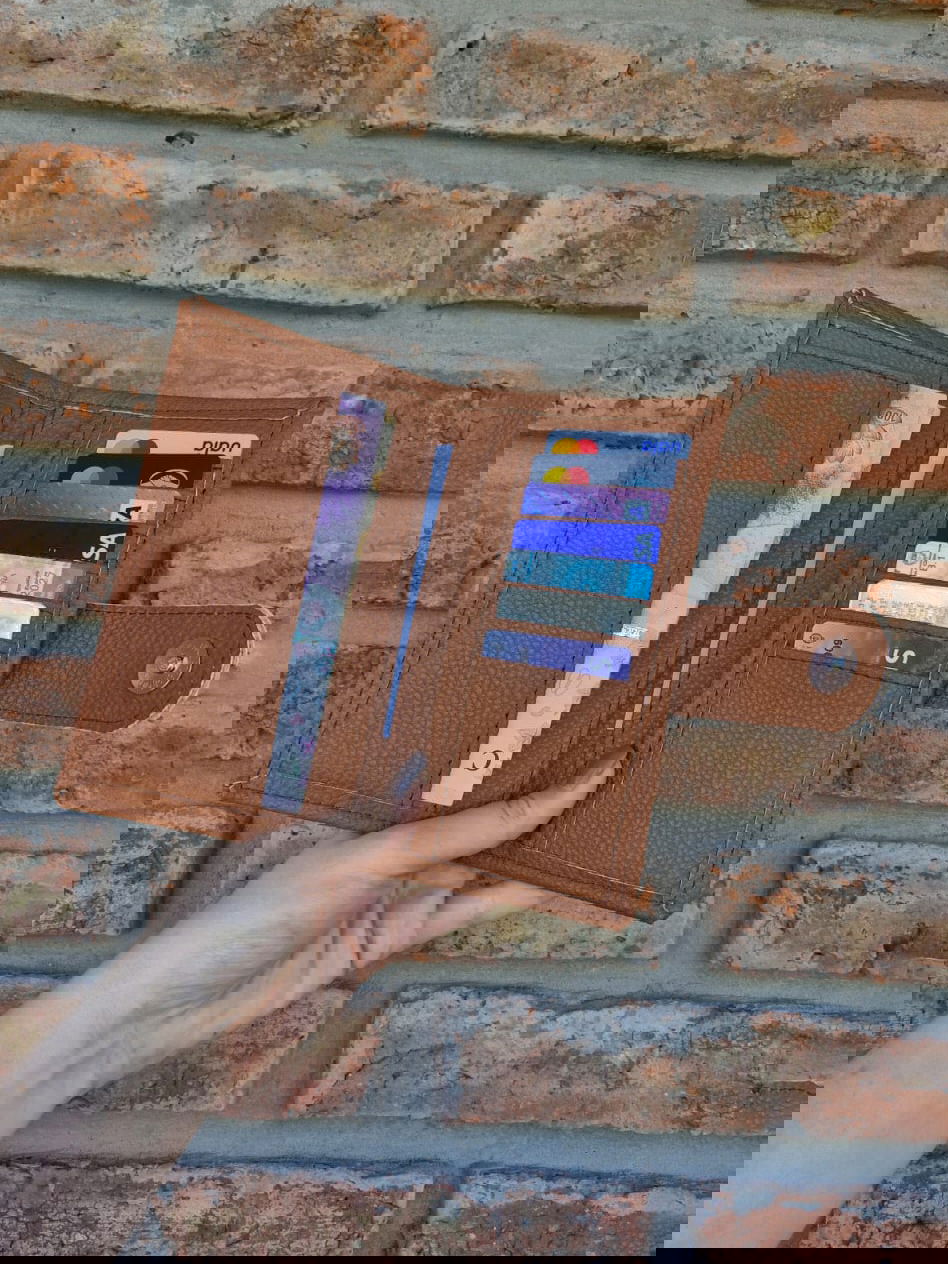 Mide 10,5 x 19,5 cerrada y 21 x 19,5 abierta. Del lado izquierdo tiene 2 solapas para billetes y un bolsillo de 9 cm de ancho. Del lado derecho tiene espacio para 7 tarjetas, un bolsillo de 7,5 cm de ancho y otro de 9 cm de ancho. A modo de cierre lleva una tira con un broche imán.