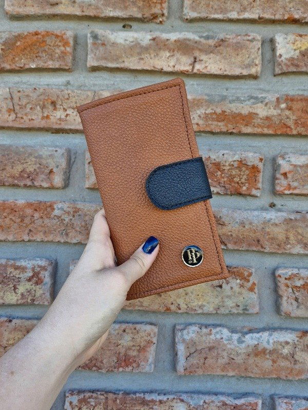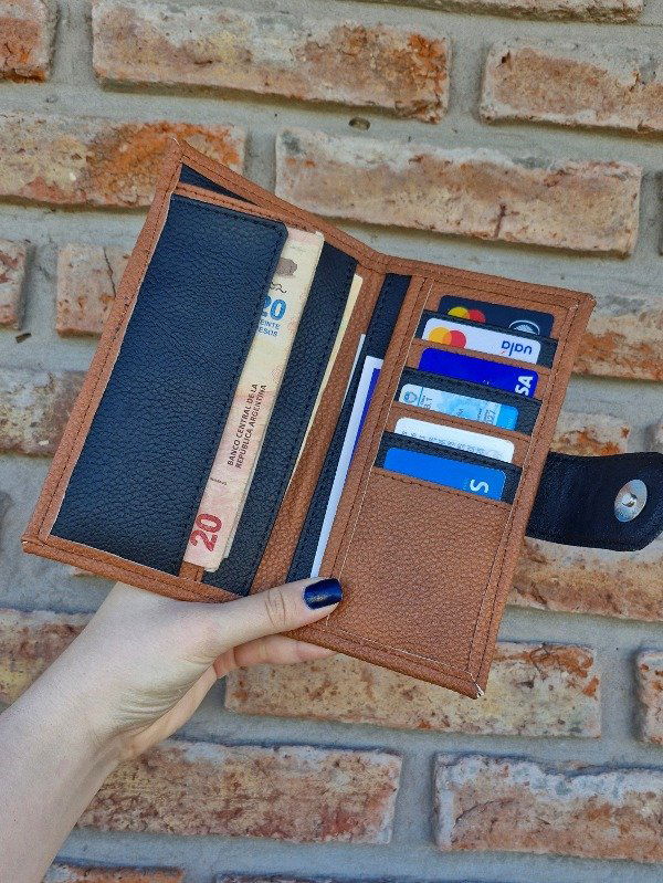 Mide 10,5 x 19,5 cerrada y 21 x 19,5 abierta. Del lado izquierdo tiene 2 solapas para billetes y un bolsillo de 9 cm de ancho. Del lado derecho tiene espacio para 7 tarjetas, un bolsillo de 7,5 cm de ancho y otro de 9 cm de ancho. A modo de cierre lleva una tira con un broche imán.