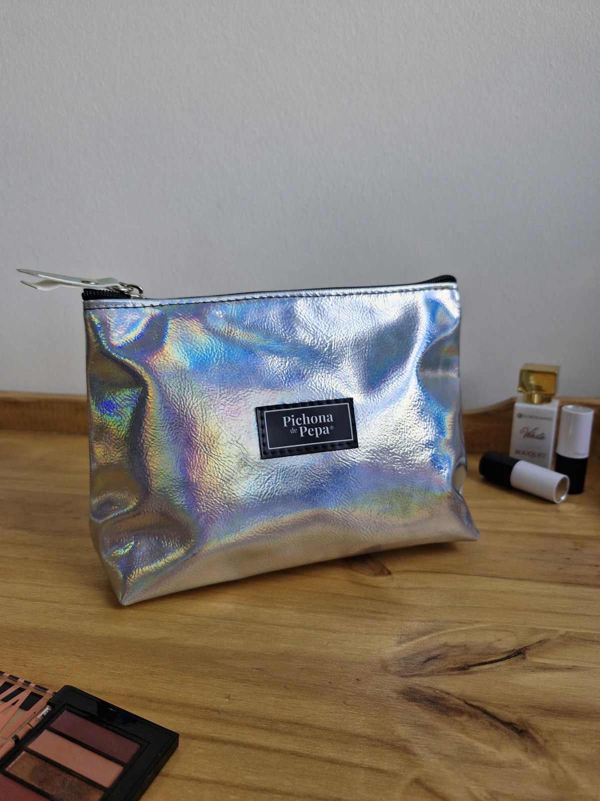 Porta cosméticos plateado tornasol