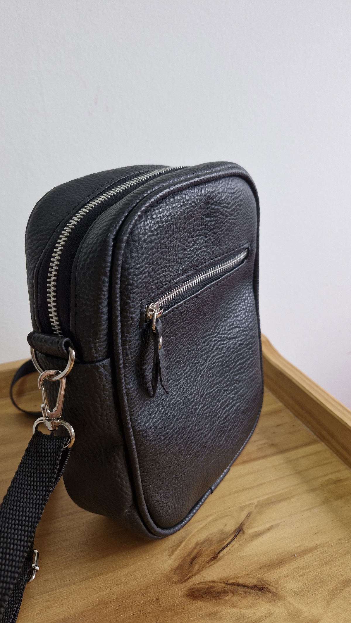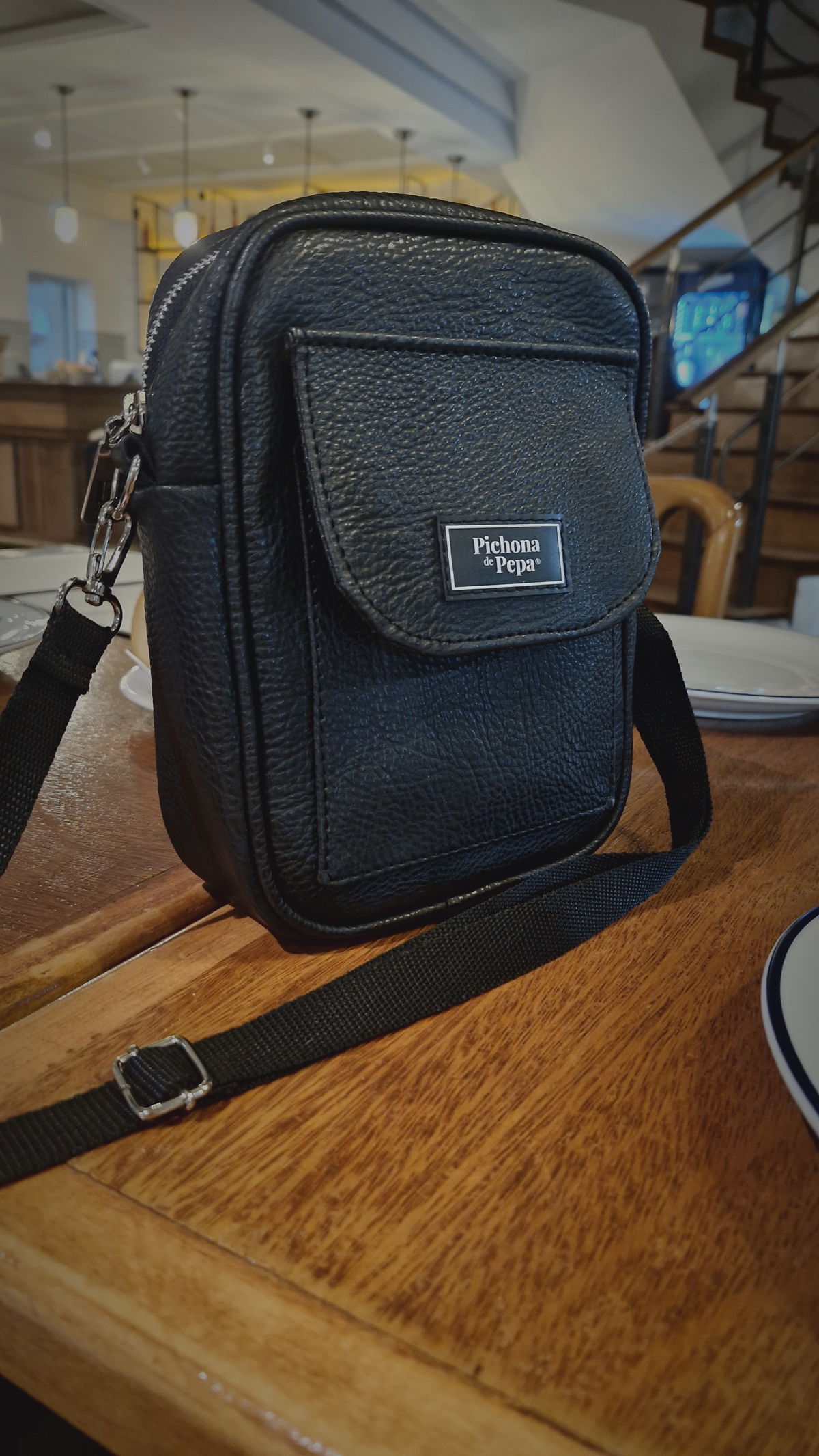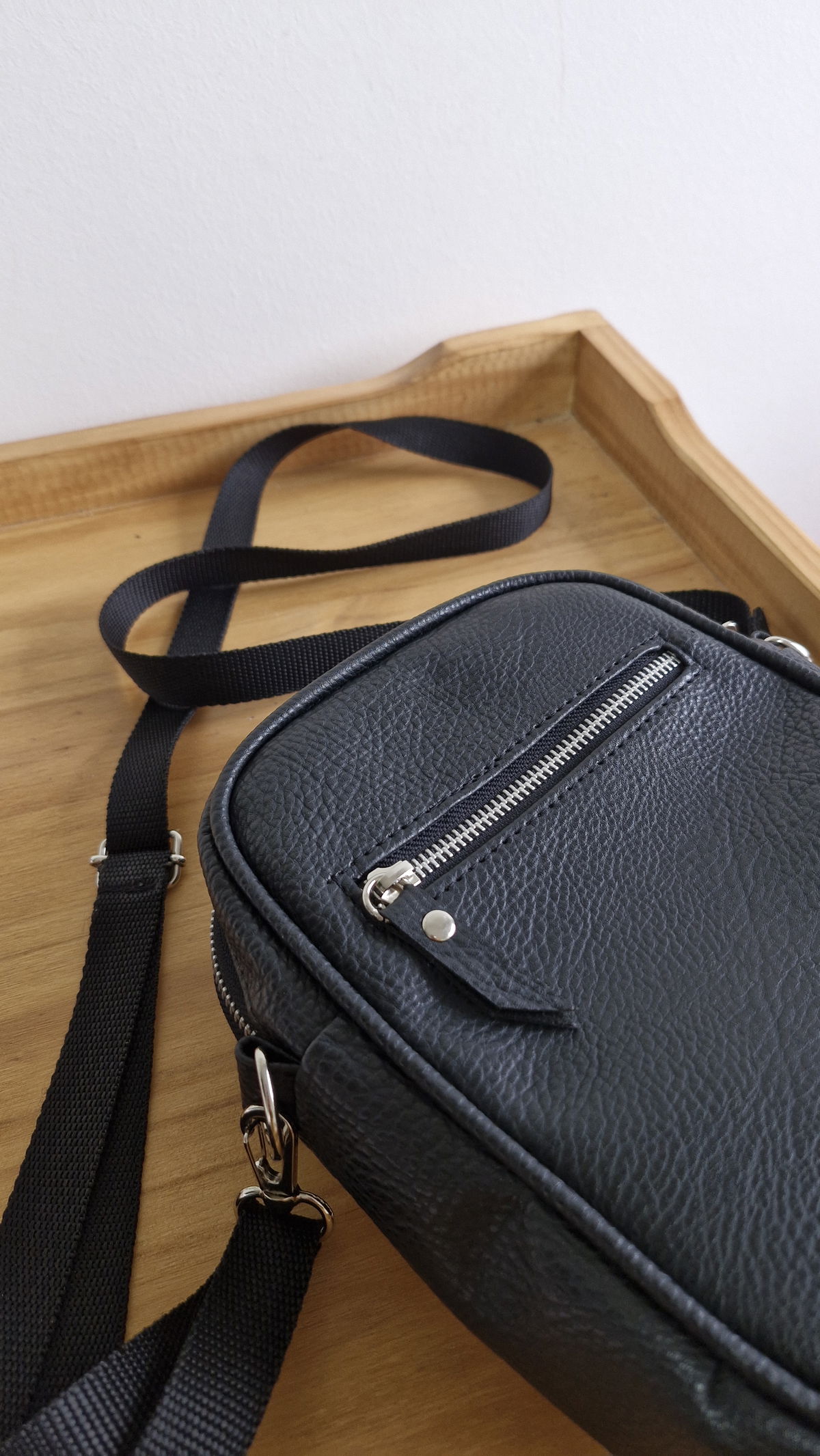 Mide 24 cm de alto por 18 cm de ancho y tiene una profundidad de 6.5 cm. Esta completamente forrada y el compartimiento principal tiene cierre. En el frente tiene un bolsillo con tapa de 14 cm x 13 cm y en la parte posterior, otro bolsillo de 13 cm x 14 cm con cierre. La correa es desmontable y su largo se puede regular entre 70 cm y 1,30.