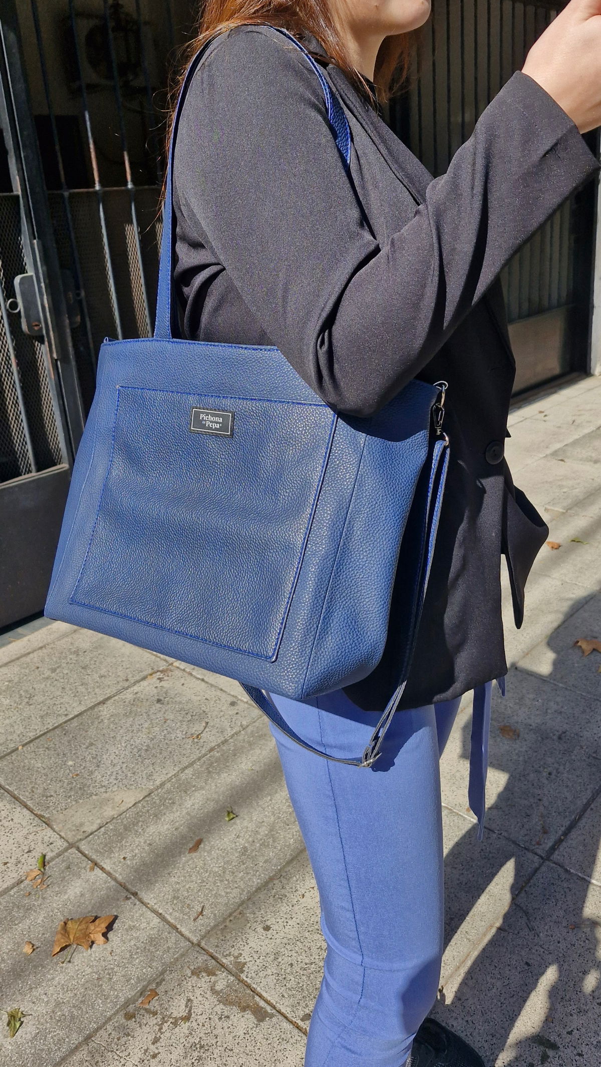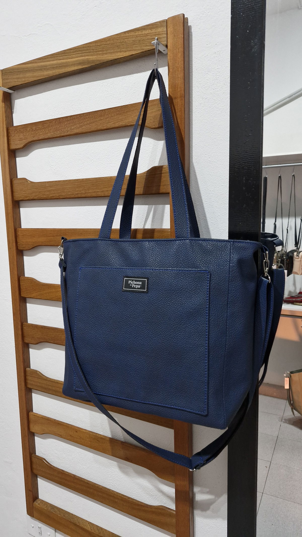 Mide 30 cm de alto por 33 cm de ancho en su base y 44 cm de ancho en su parte superior, con una profundidad de 13 cm. Esta completamente forrada, el compartimiento principal tiene cierre y en su interior cuenta con un bolsillo de 20 x 14 cm. En el frente tiene otro bolsillo de 26 cm x23 cm con un broche imán a modo de cierre. Las correas de hombro tienen 60 cm de largo y adicionalmente viene con una correa larga desmontable cuyo largo se puede regular entre 70 cm y 1,30.
