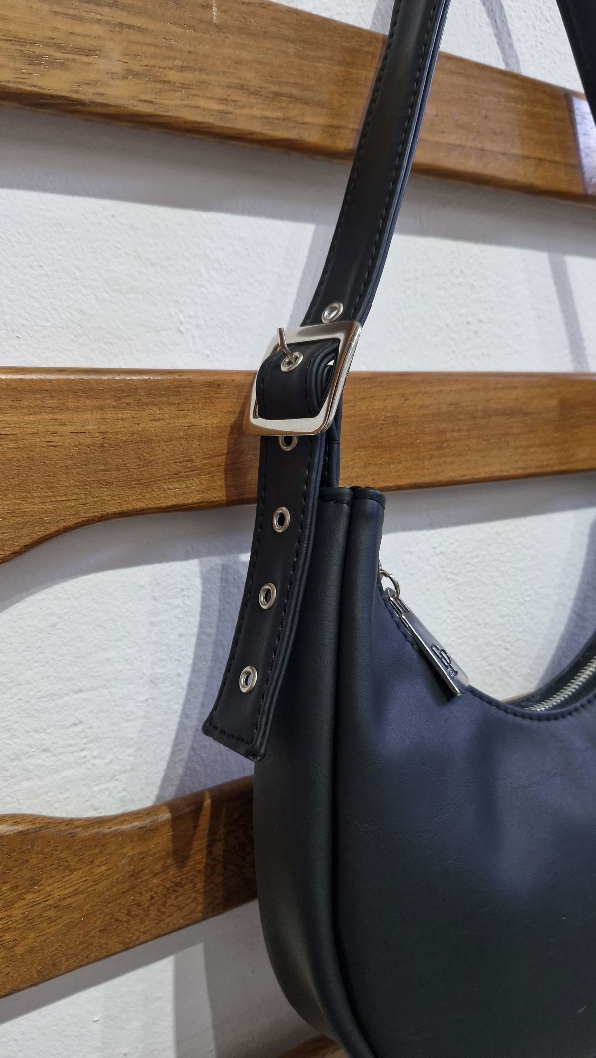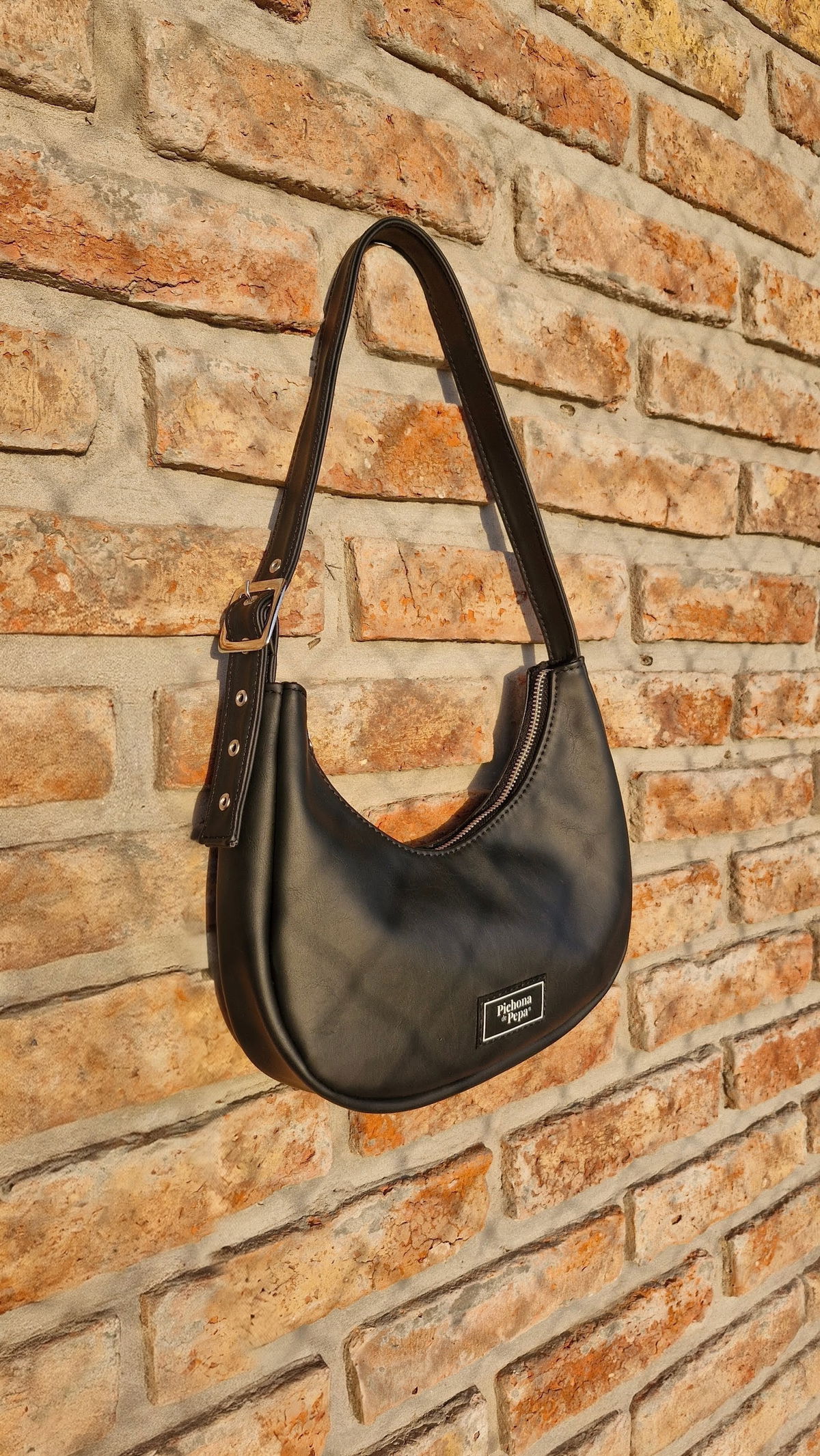 Mide 26 cm de ancho por 13 cm de alto, con una profundidad de 6 cm. Esta completamente forrada, tiene un único compartimento con cierre de punta a punta. La correa mide 60 cm y tiene ojales para regular su largo.